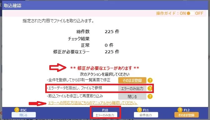 4. CSVに不備があるとエラーが出ます。エラー内容を確認して再度取込してください。