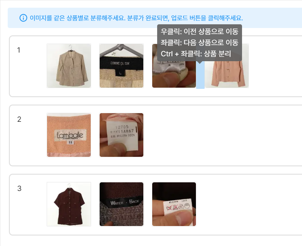 AI는 상품의 정면 이미지를 상품의 시작으로 보고, 브랜드 택이나 라벨 이미지를 상품의 끝으로 인식하여 상품을 구분하고 있어요. 그래서 정면 이미지를 맨 처음에, 브랜드 택이나 라벨 이미지를 맨 마지막에 찍어서 이미지 촬영 순서를 꼭 지켜주셔야 해요.