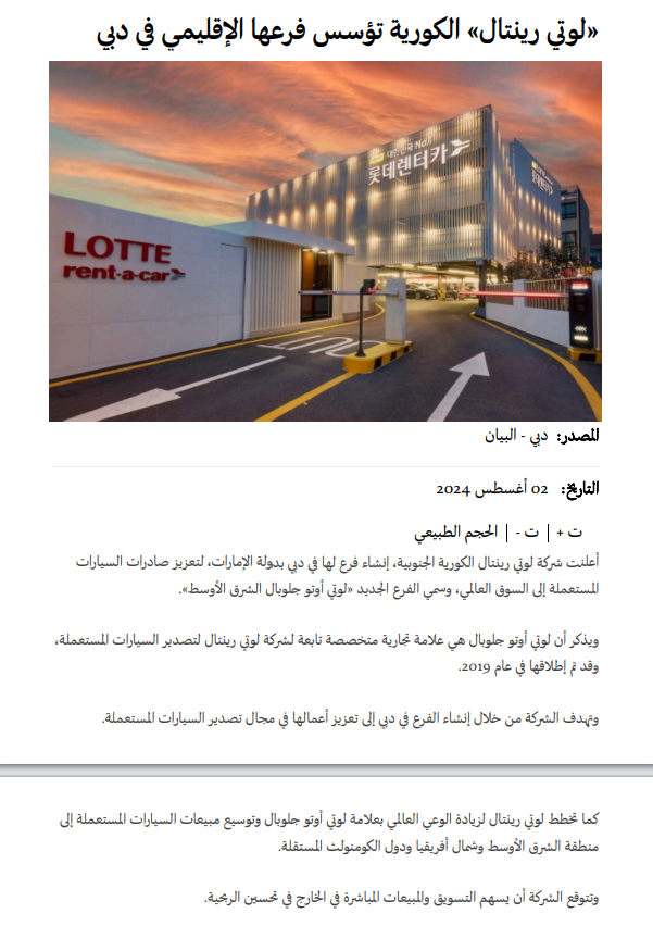 أعلنت شركة لوتي رينتال الكورية الجنوبية، إنشاء فرع لها في دبي بدولة الإمارات، لتعزيز صادرات السيارات المستعملة إلى السوق العالمي، وسمي الفرع الجديد «لوتي أوتو جلوبال الشرق الأوسط».