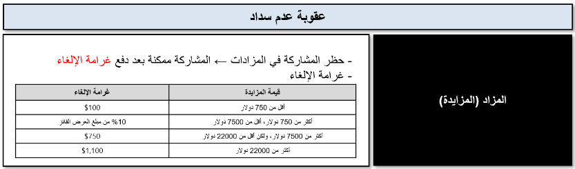 *إذا لم يتم الدفع بعد الفوز بالمنزايدة، فسيتم تعليق العضوية إلى أجل غير مسمى.