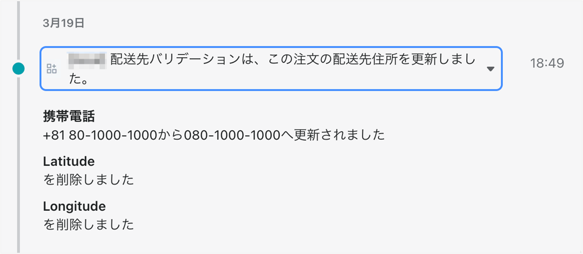 注文のタイムラインで「Latitudeを削除しました」「Longitudeを削除しました」と表示されることがあります。