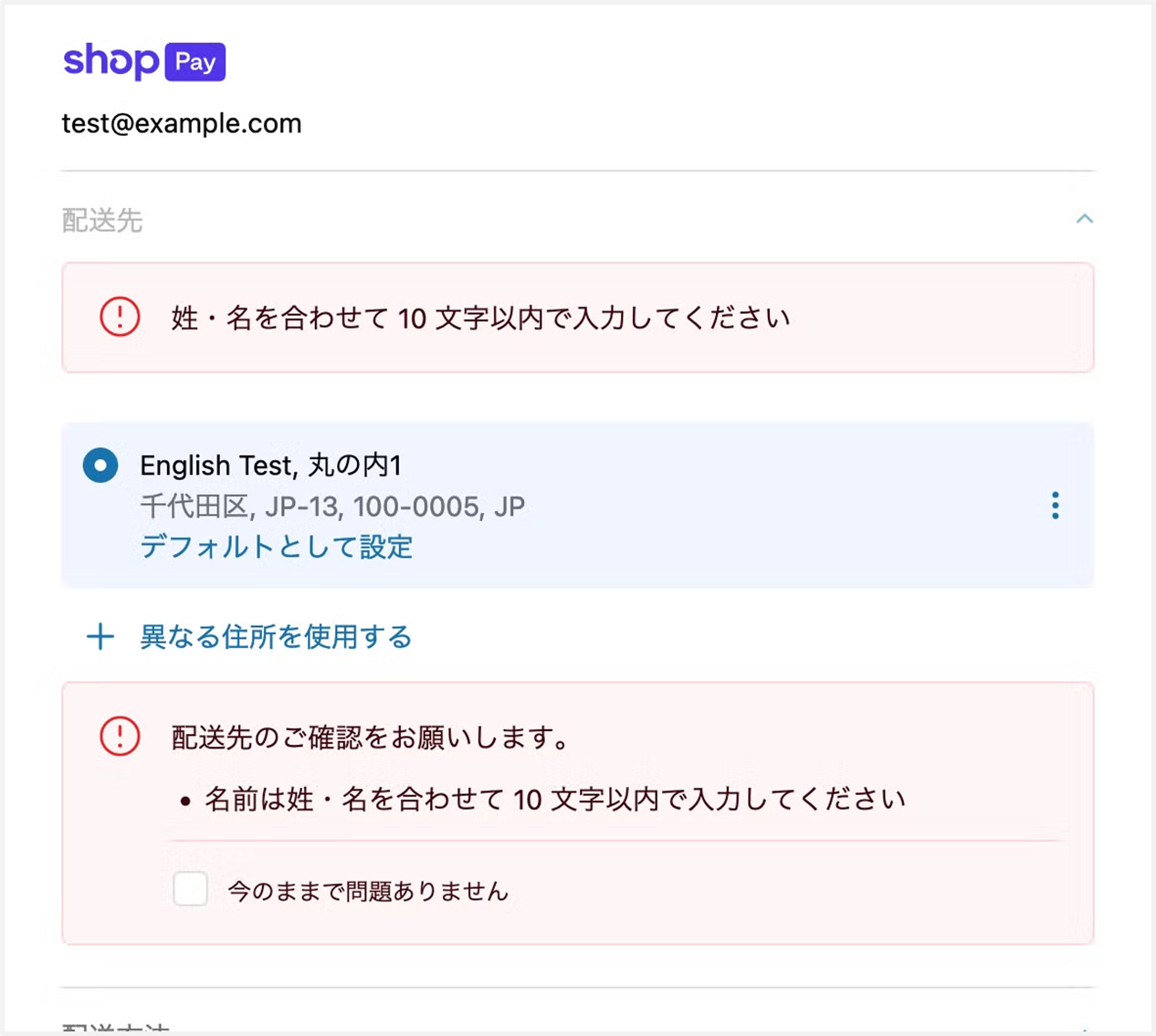 Shopify の仕様上、Shop Pay 以外のエクスプレスチェックアウトでは、チェックアウトをカスタマイズできません。 そのため、バリデーションは動作しません。