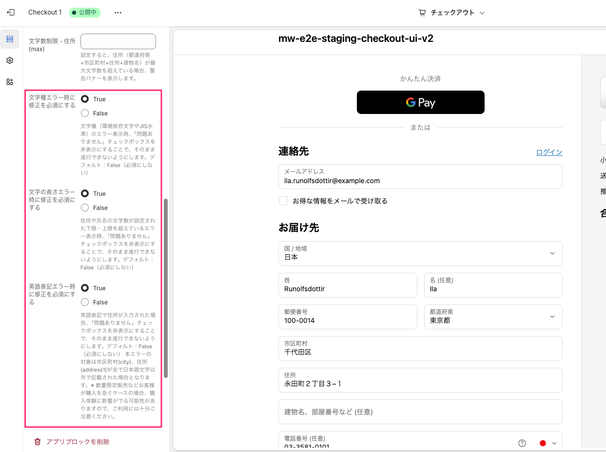 設定の変更はチェックアウトエディタのアプリブロックから行えます。