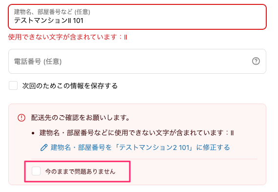 しかしながら、配送システムが対応していない入力内容では必ずストア様による対応が必要となるため、特定のエラー時に本チェックボックスを非表示にし、必ず修正が必要となるようなオプションを設定項目として追加しました。