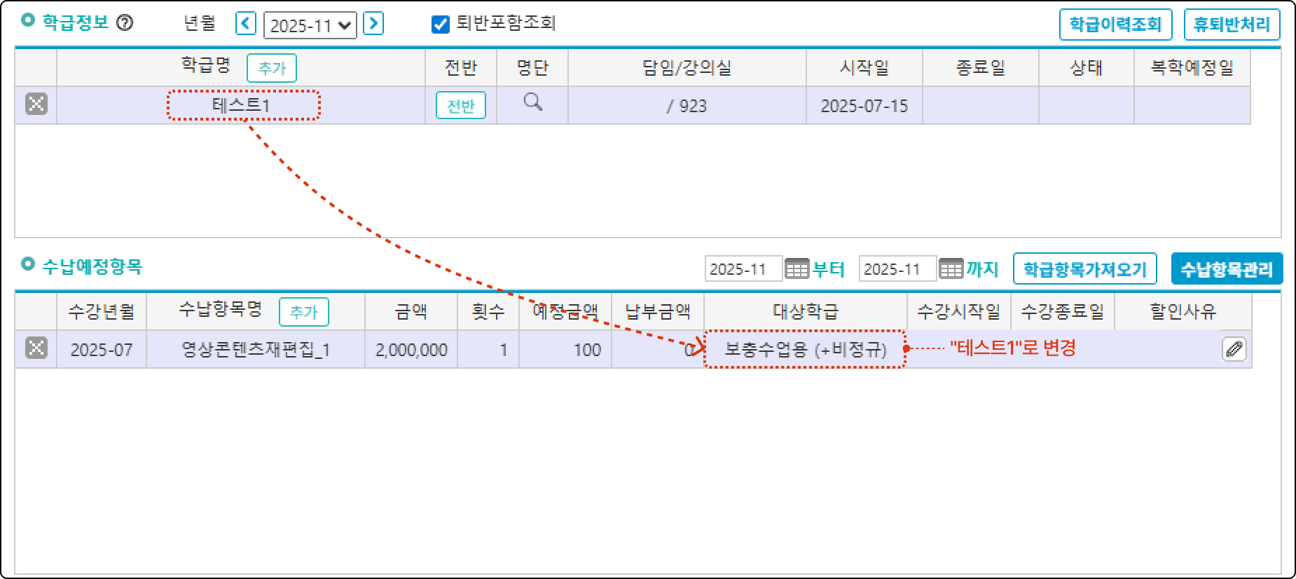 청구 또는 수납이 완료된 수납항목의 대상학급이 현재 수강 중인 학급과 다른 경우 발생하는 현상입니다. 수납항목의 대상학급을 확인하여 수강 중인 학급과 일치하게 수정해 주시면 해결됩니다.