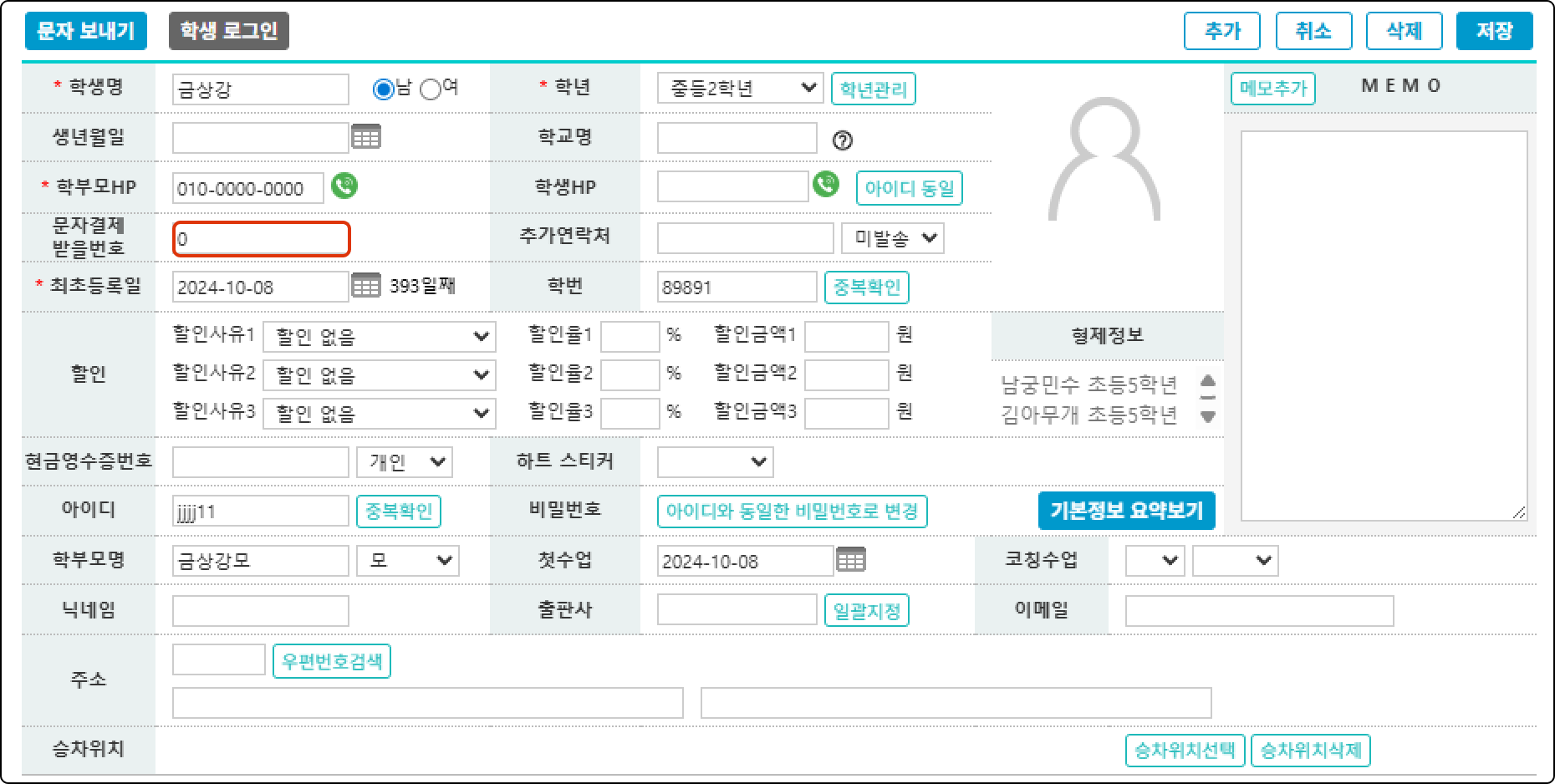 특정 학생의 문자결제 발송을 제외하고 싶다면, 문자 결제 받을번호를 '0'으로 저장하시면 발송 실패로 처리되어 문자결제가 발송되지 않습니다.
