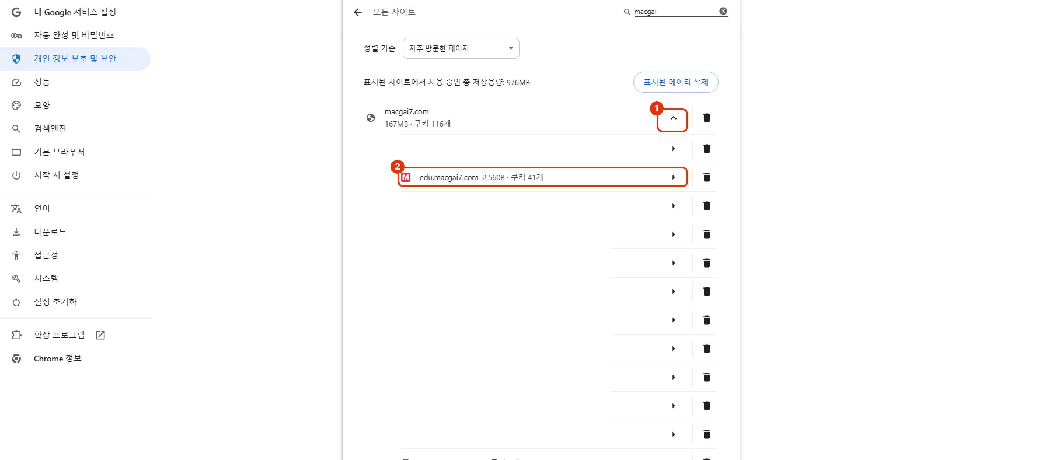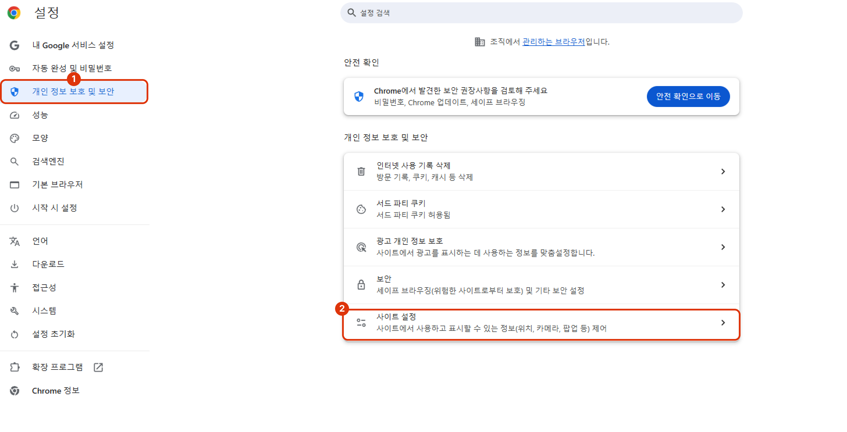 개인 정보 보호 및 보안 클릭