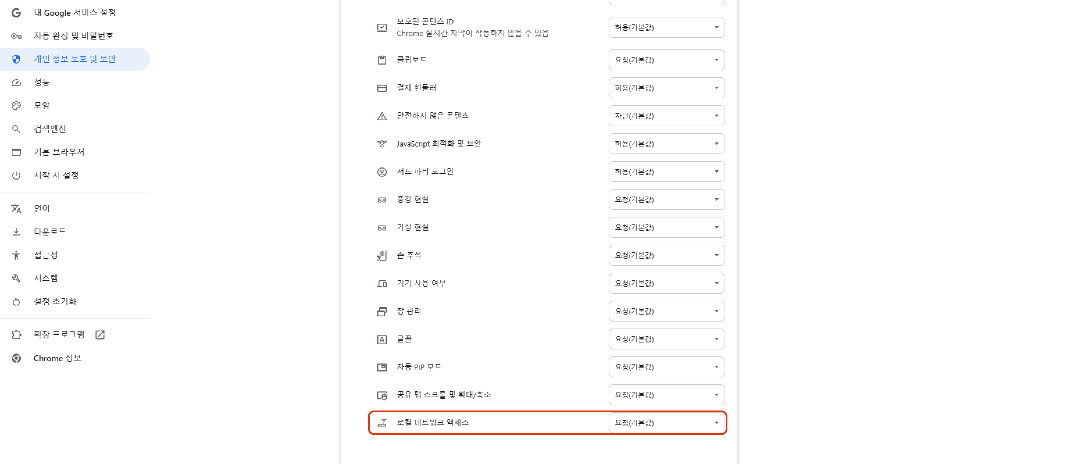 로컬 네트워크 엑세스 항목의 권한을 요청 또는 허용으로 변경