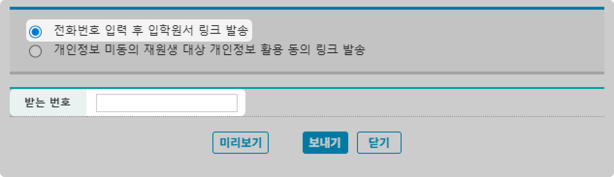 전화번호로 입학원서 링크를 발송할 수 있는 옵션을 선택 후 전화번호를 입력하면 링크를 보낼 수 있어요.
