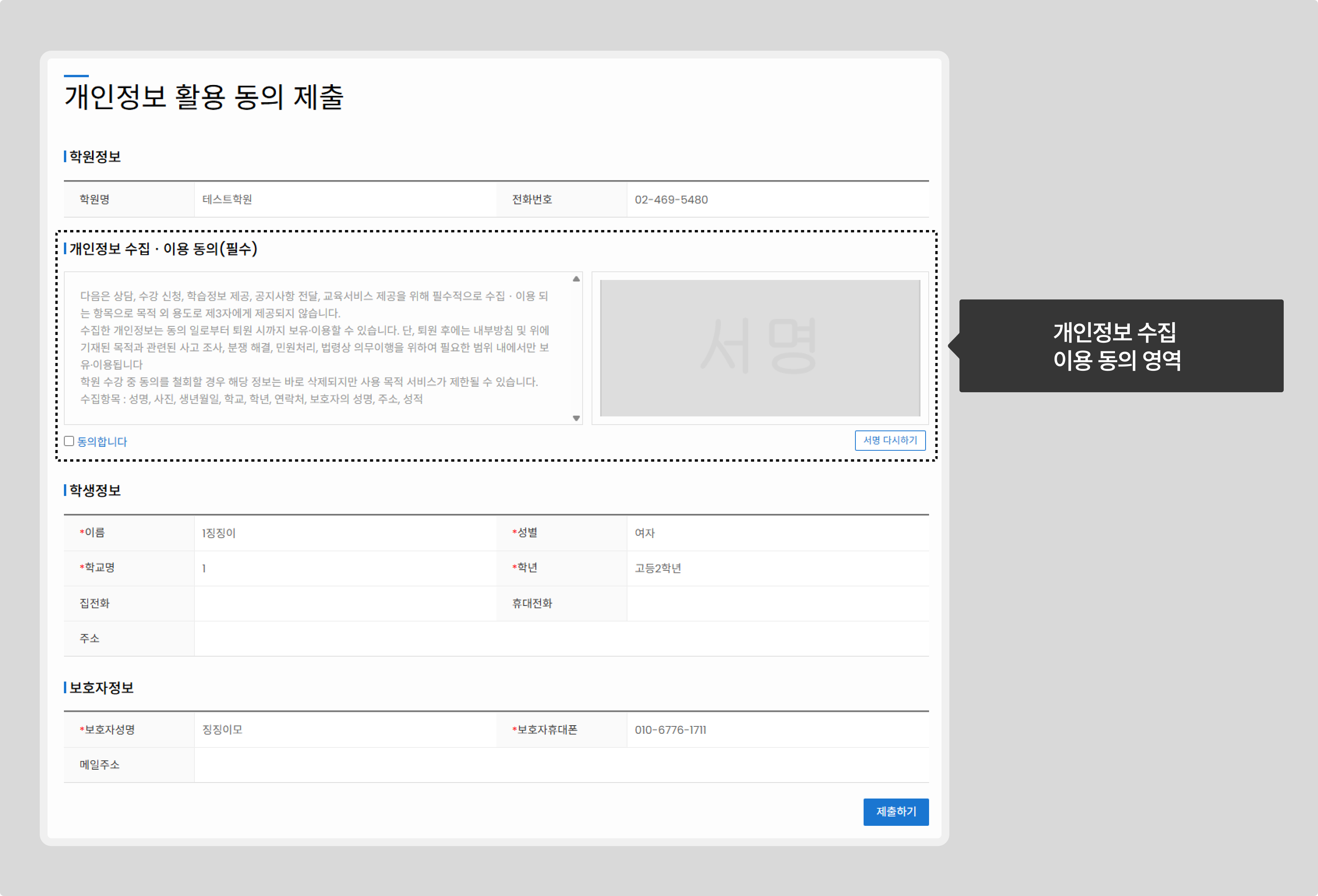 재원생 대상이기 때문에 개인정보 활용 동의 영역만 작성할 수 있어요.