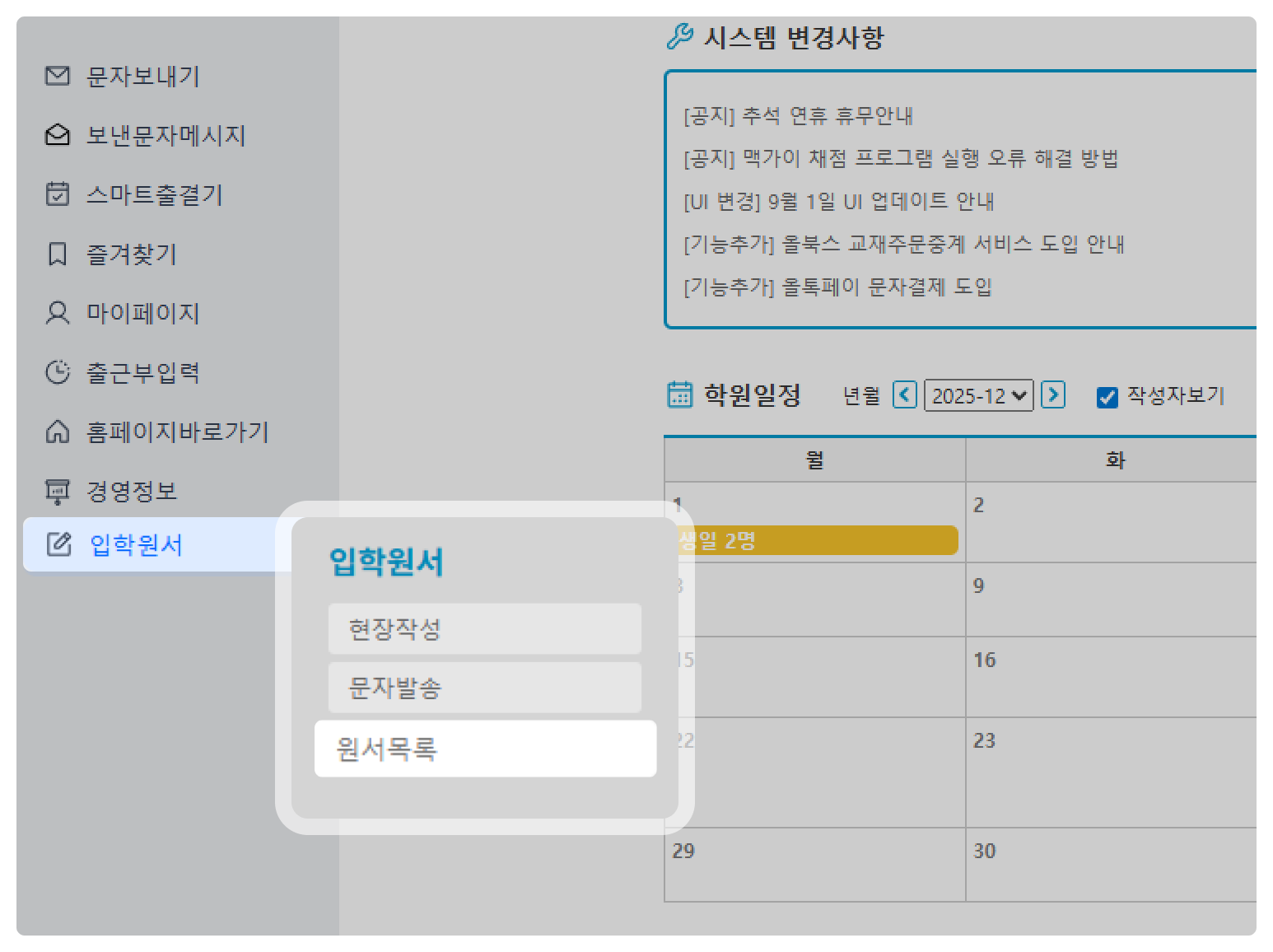 좌측 사이드바에서 [원서목록] 메뉴를 클릭해 주세요.