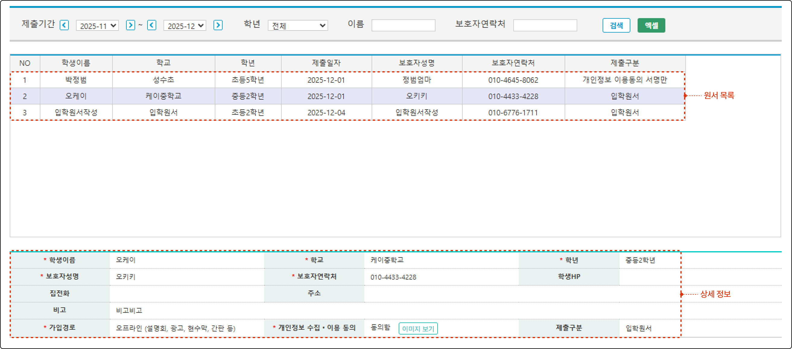입학원서 및 개인정보 동의 목록을 확인할 수 있습니다.