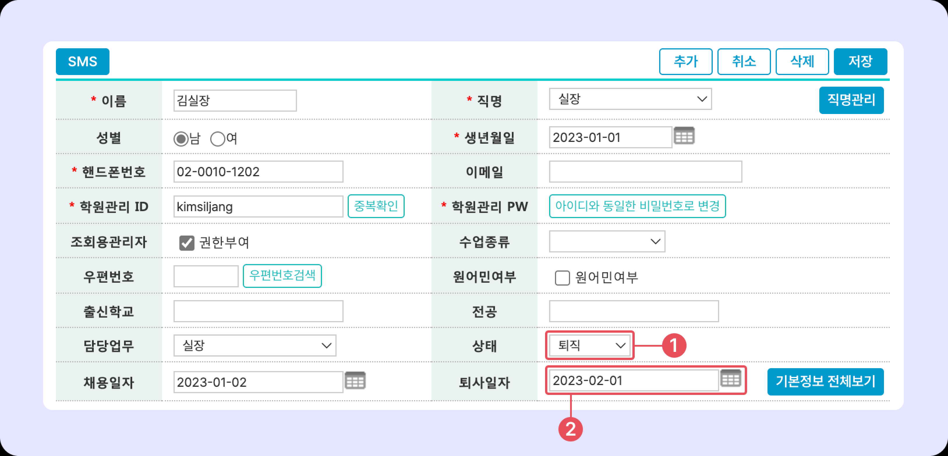 퇴사일자(마지막 근무일)를 지정하고 [저장]을 누르면 퇴직 처리가 완료됩니다.