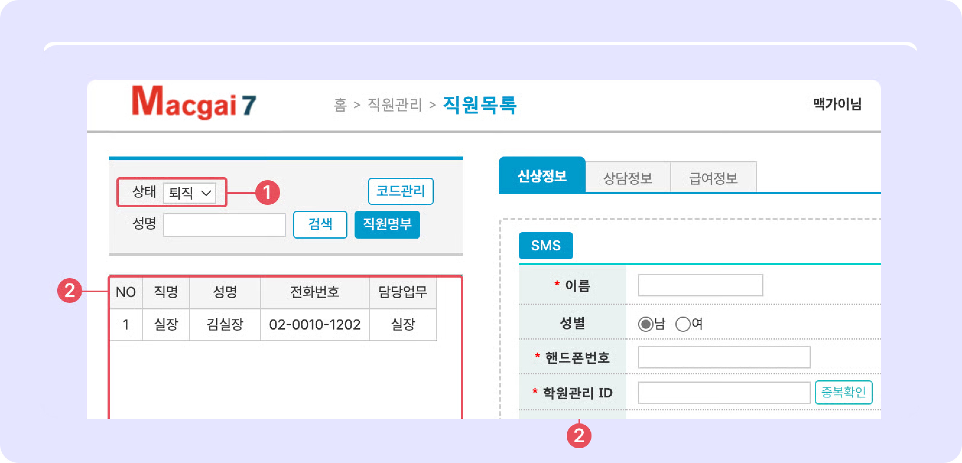 이용메뉴: 관리메뉴 → 직원관리 → 직원목록