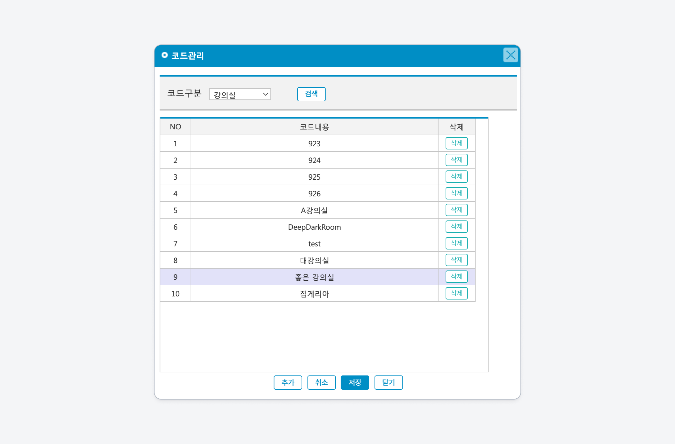 수업을 진행하는 강의실 정보를 관리합니다. 강의실 목록은 수업 계획 정보의 항목으로 사용됩니다.