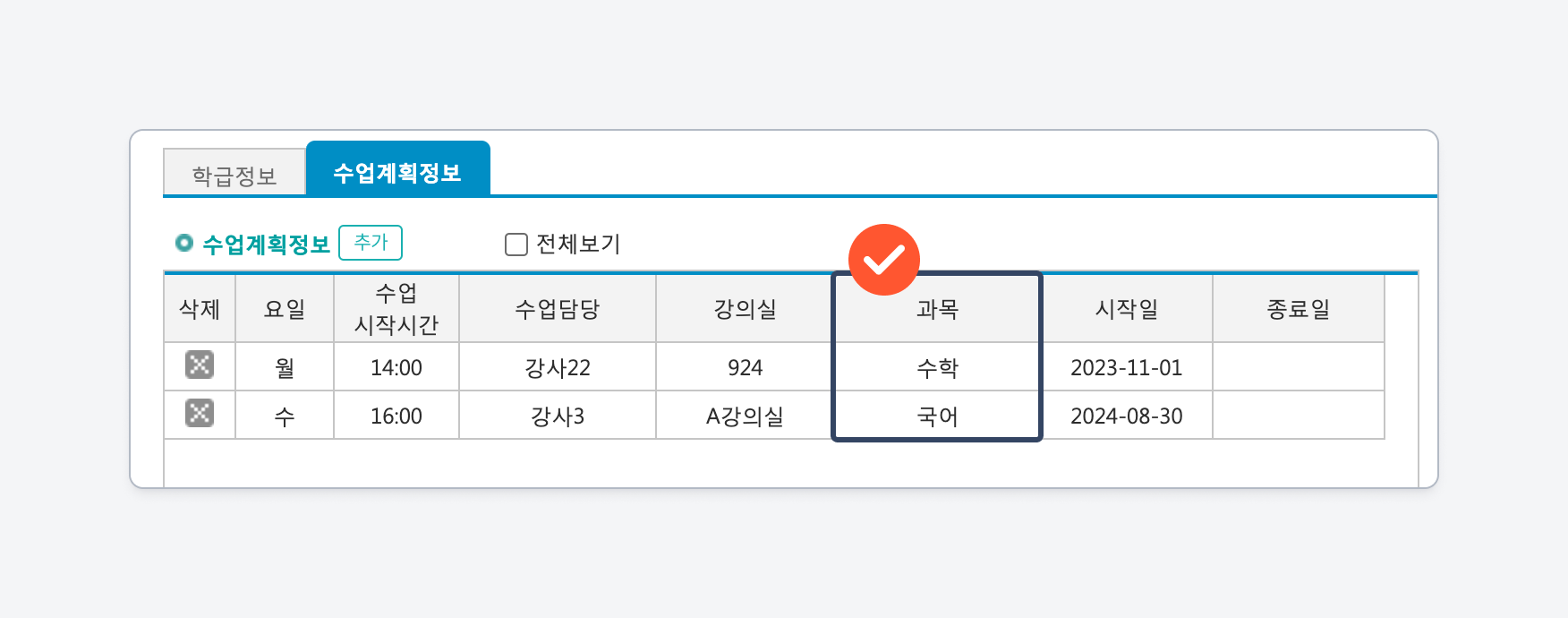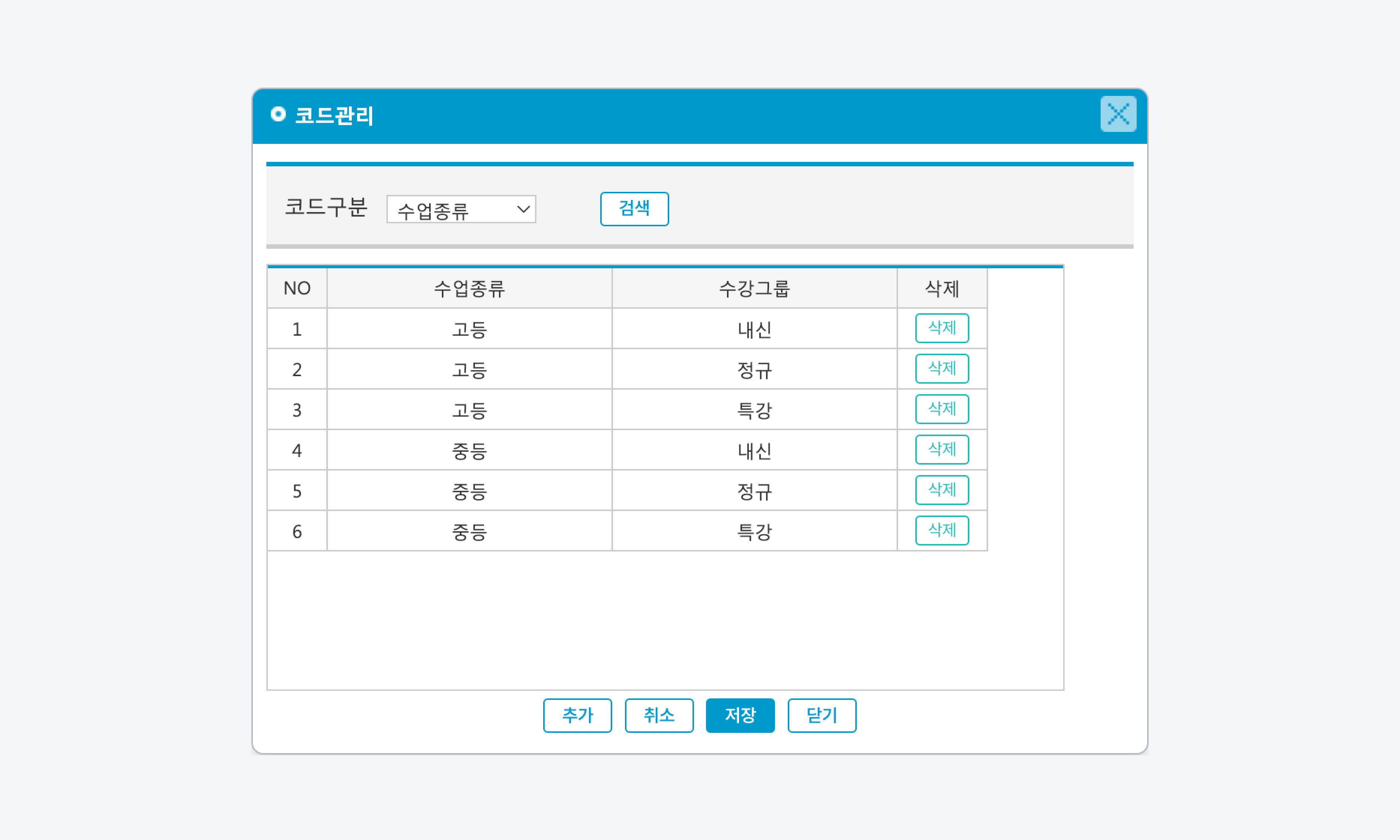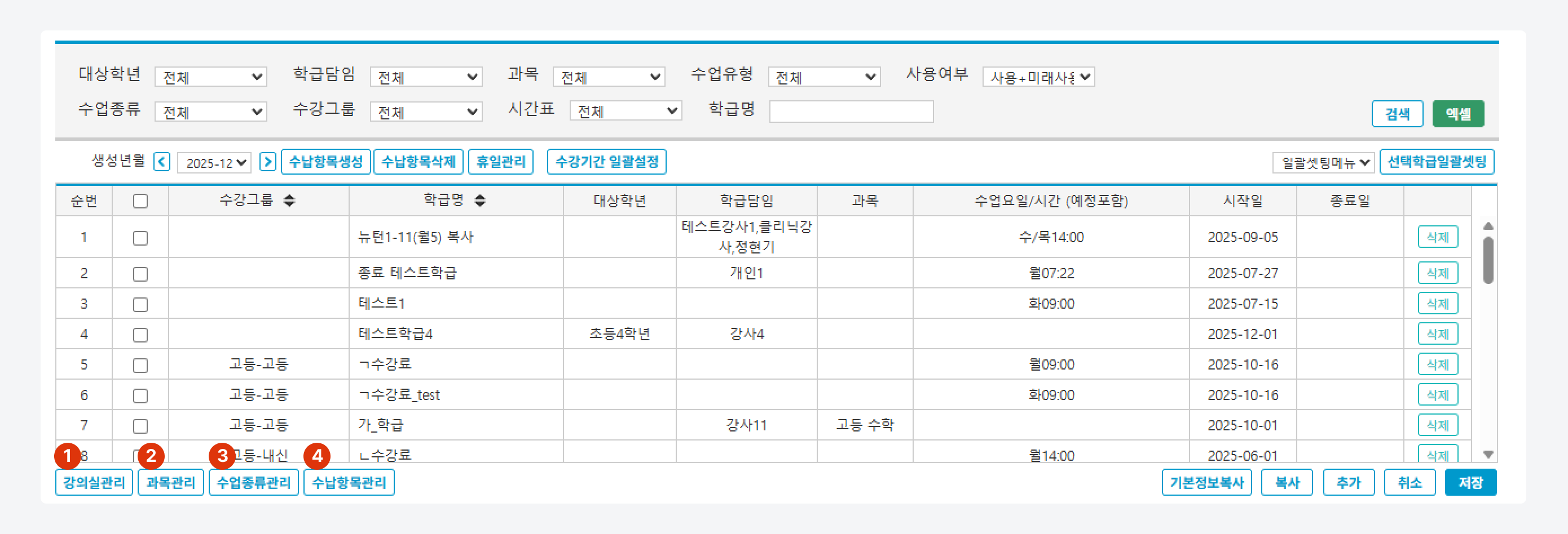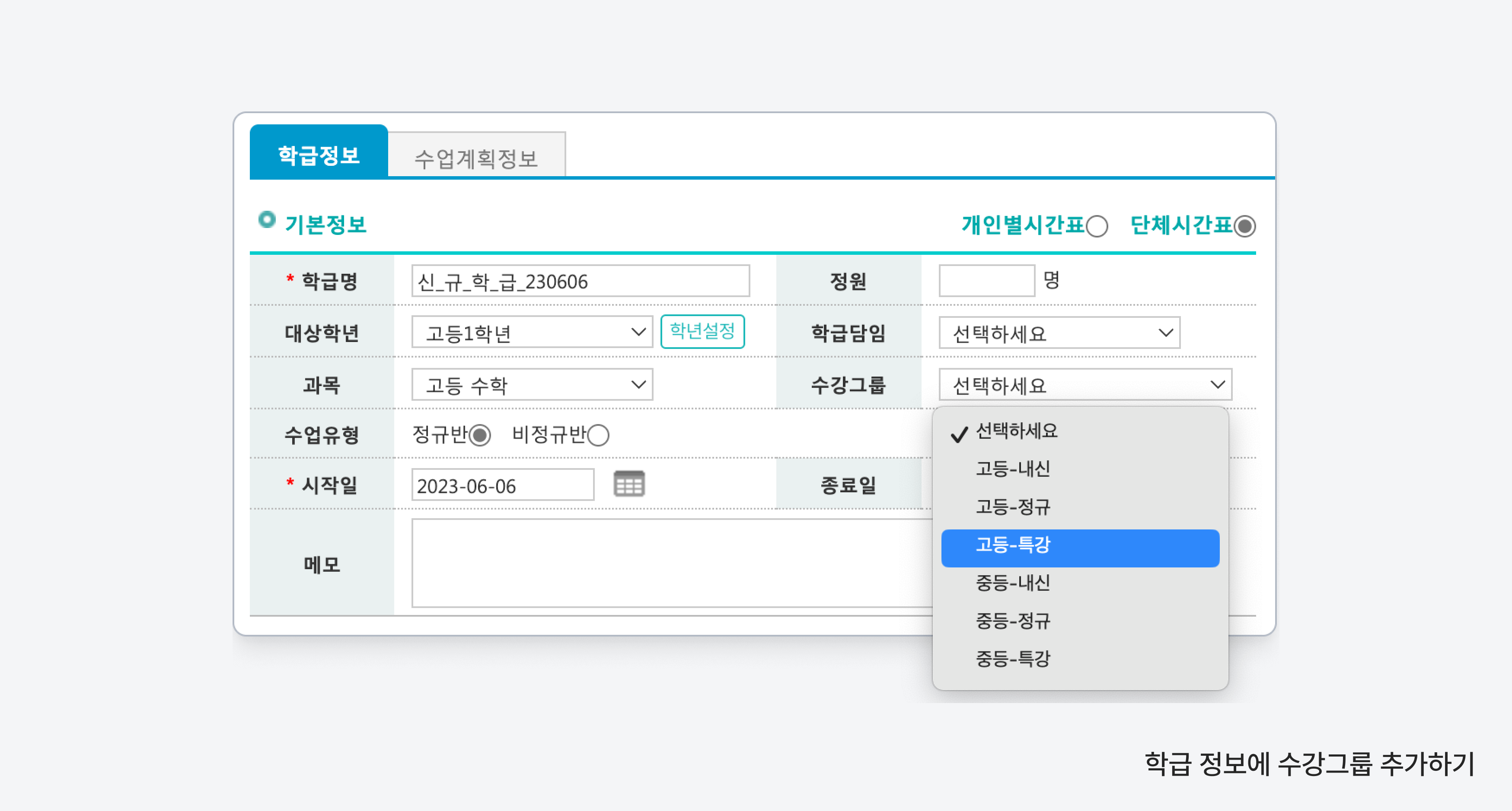 수업종류와 수강그룹을 지정해 학급 및 수업을 구분하고 검색하는데 이용됩니다.
