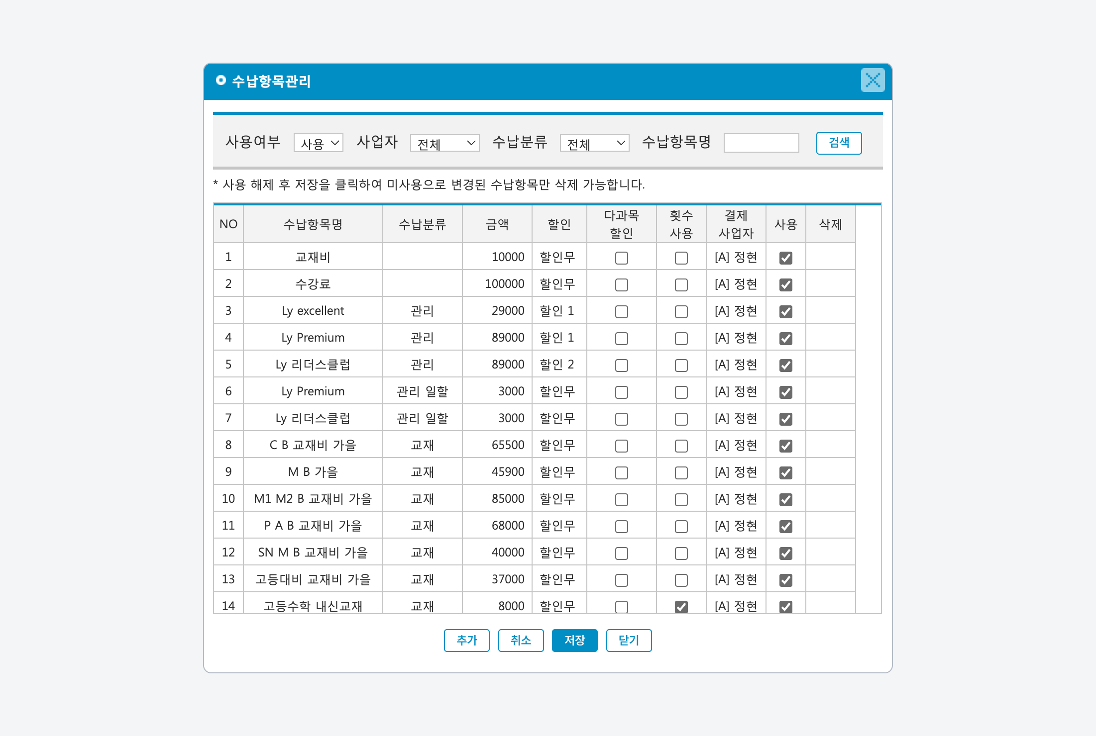 수납 항목을 생성하고 관리합니다. 수납 항목은 학급의 월 수강료로 설정하거나 기타 수납 항목으로 사용할 수 있습니다.