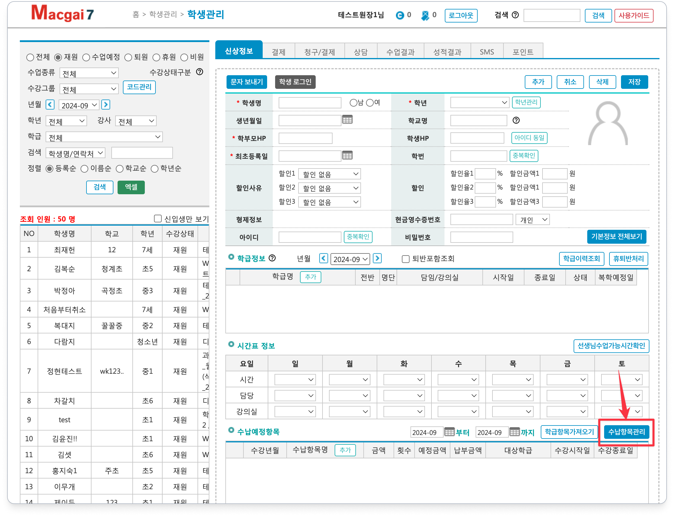 [수납항목관리] 는 학생관리 메뉴에서도 사용할 수 있어요.