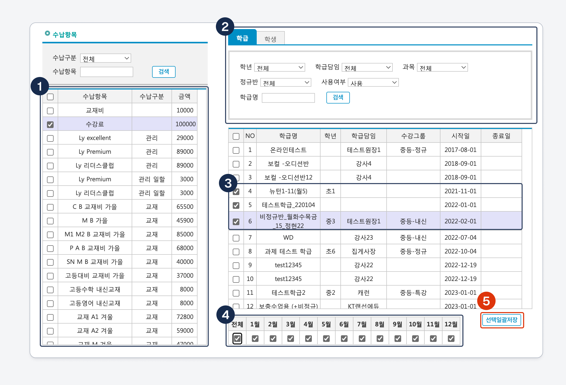 [선택일괄저장]을 누르면 학급에 수강료가 일괄 추가됩니다.