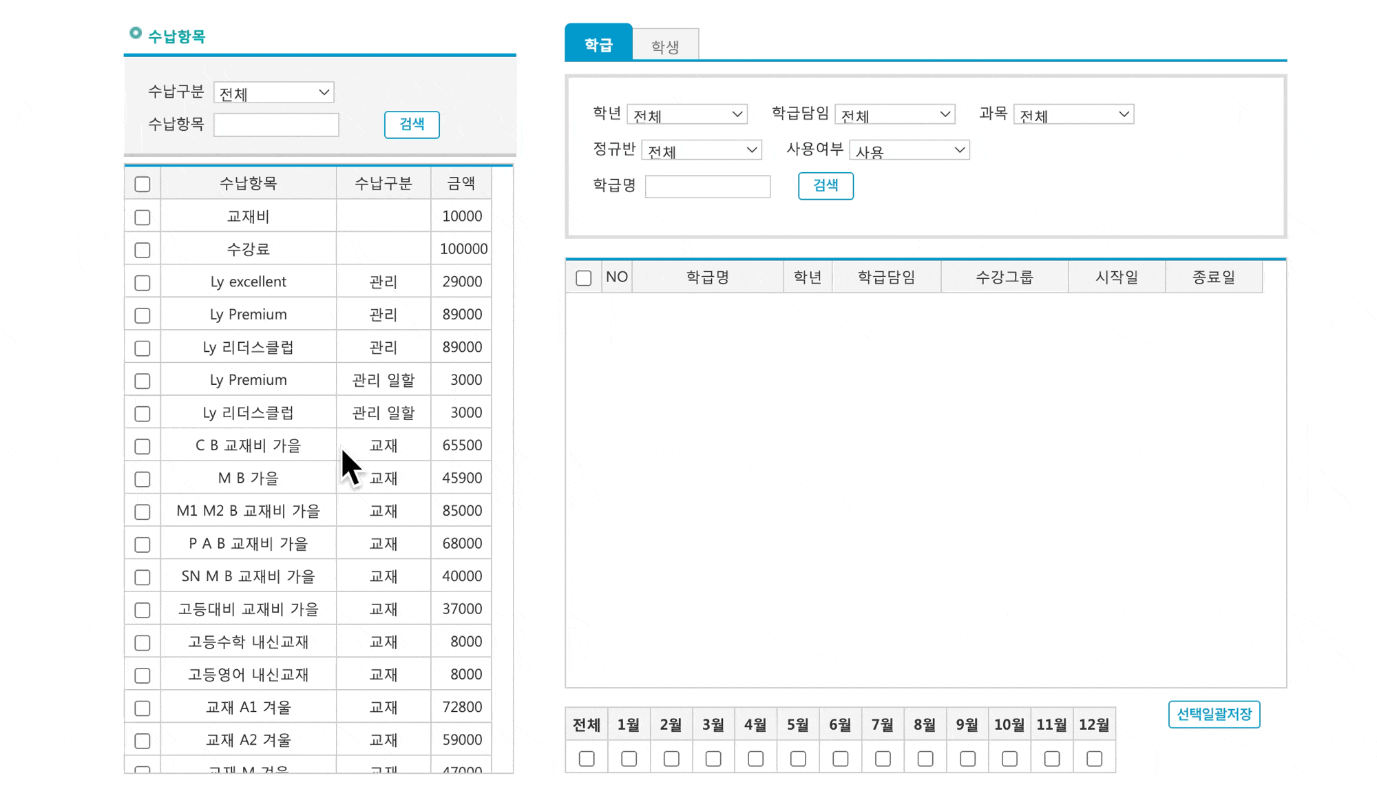 학급에 수납 항목을 추가해 월수강료를 설정할 수 있어요.