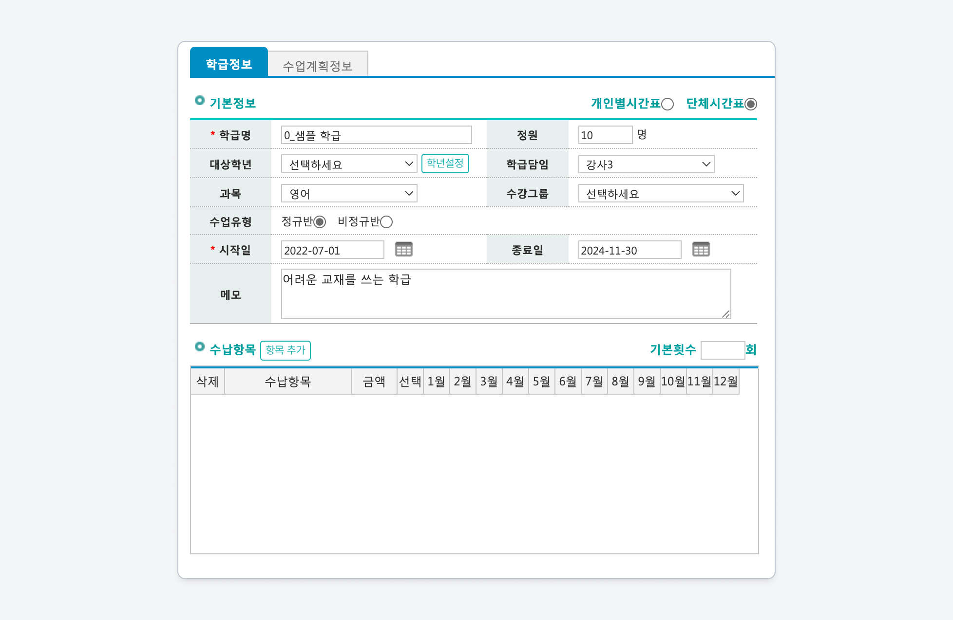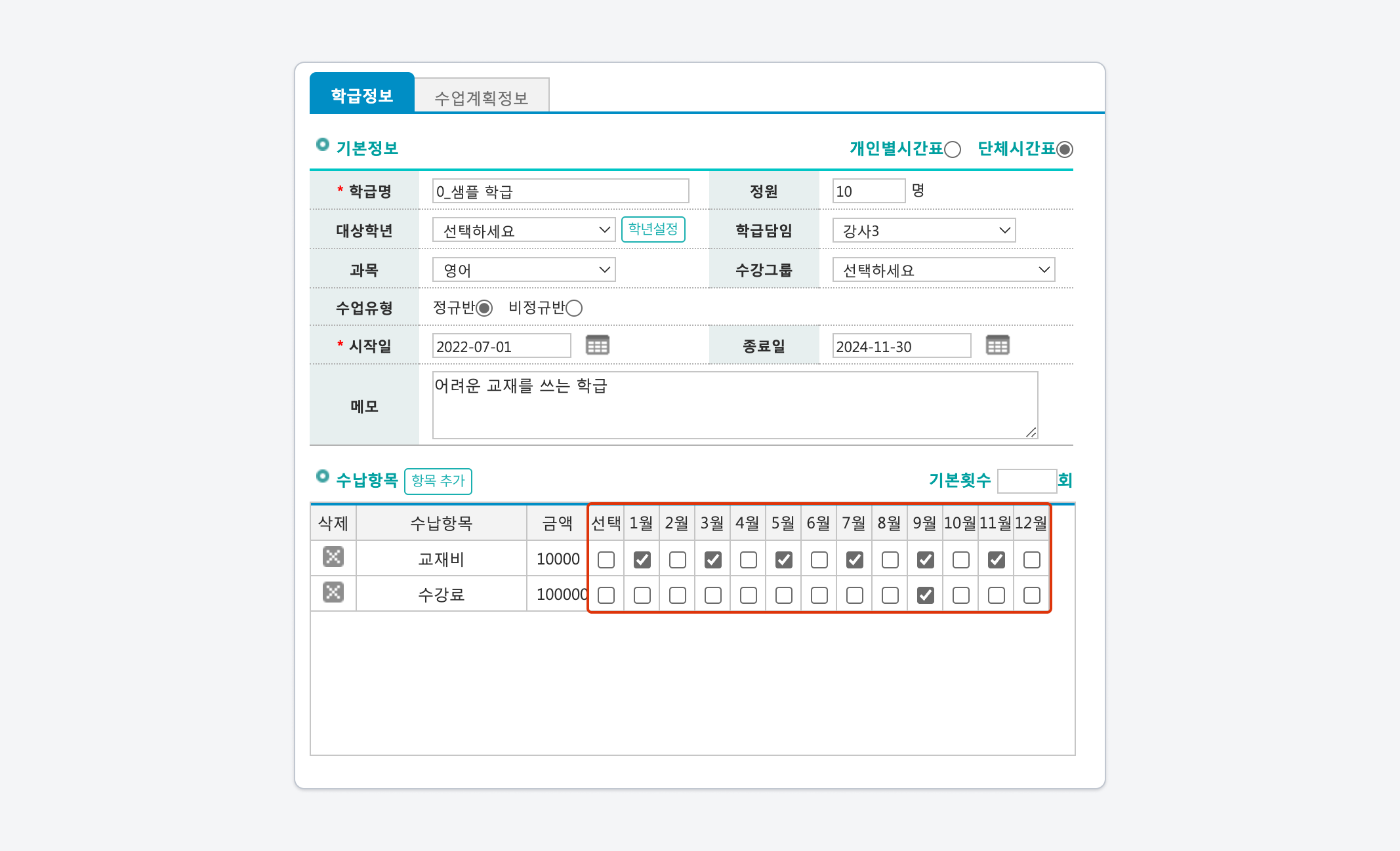 월마다 수강료 혹은 진행 주차가 다르거나 특정 월에 수업을 진행하지 않는 케이스에 활용할 수 있습니다.