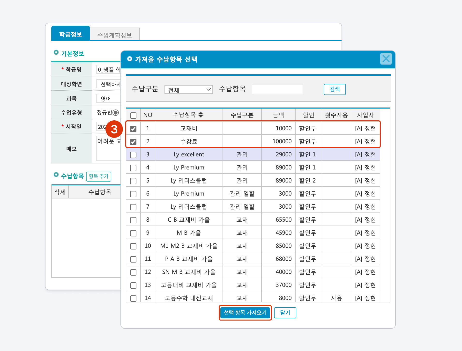 학급에 추가할 1개 이상의 수납 항목을 선택