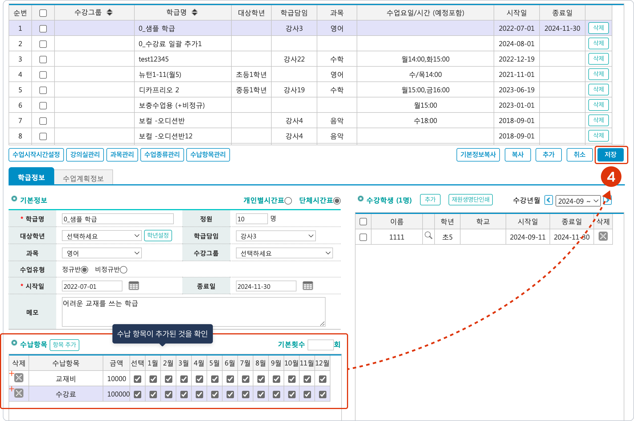 추가 된 수납항목 확인 후, 학급 리스트 우측 하단의 [저장]을 눌러 수납 항목 추가를 완료합니다.