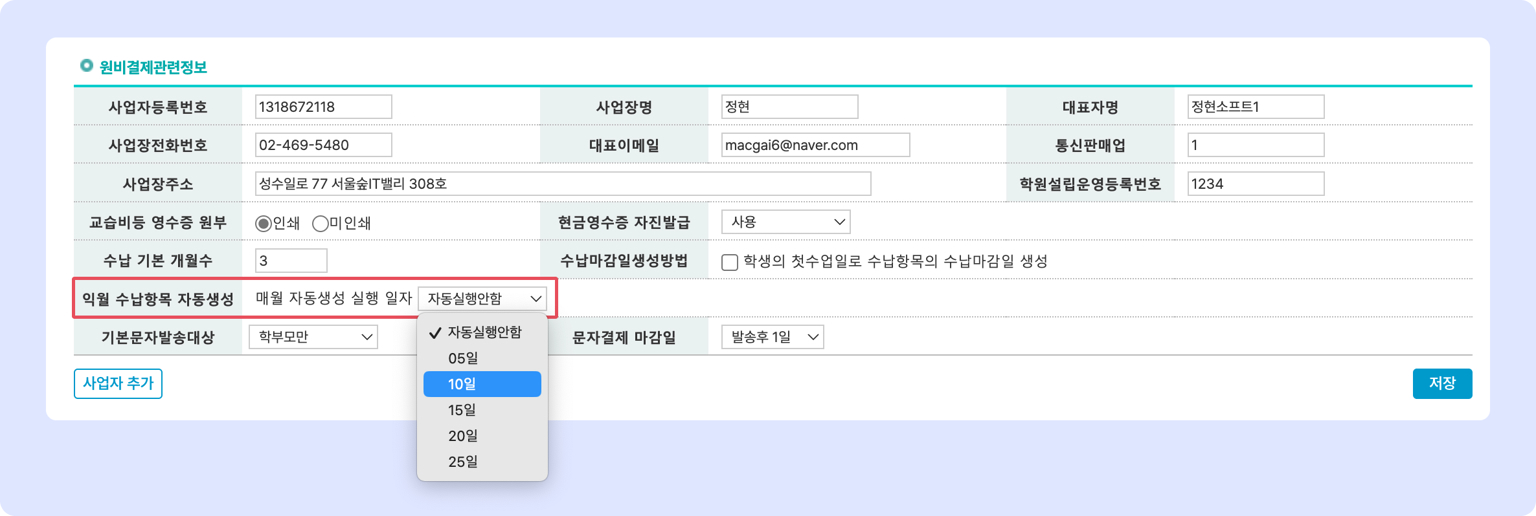 날짜를 지정해 다음 달 수강료가 자동 생성 되도록 설정할 수 있습니다.