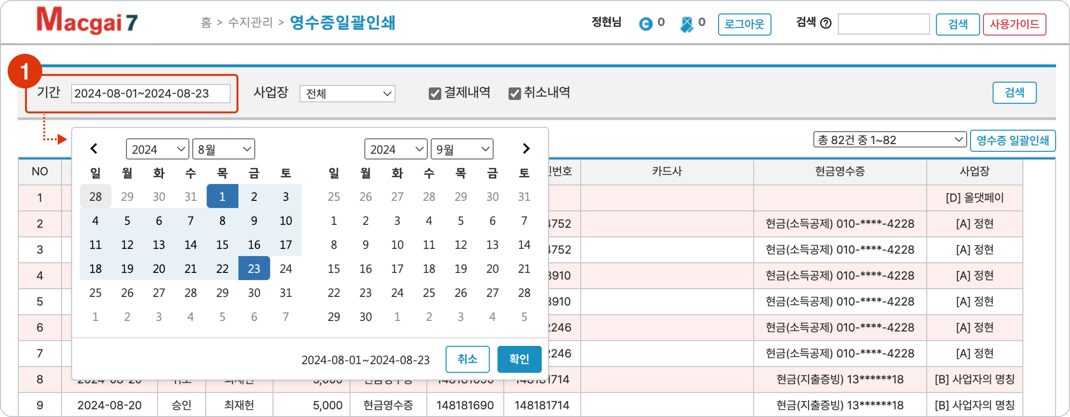 영수증 일괄 인쇄 이용 시, 사업자를 잘 확인하시어 추후 매출 신고 시 문제가 없도록 잘 확인해주셔야 합니다.