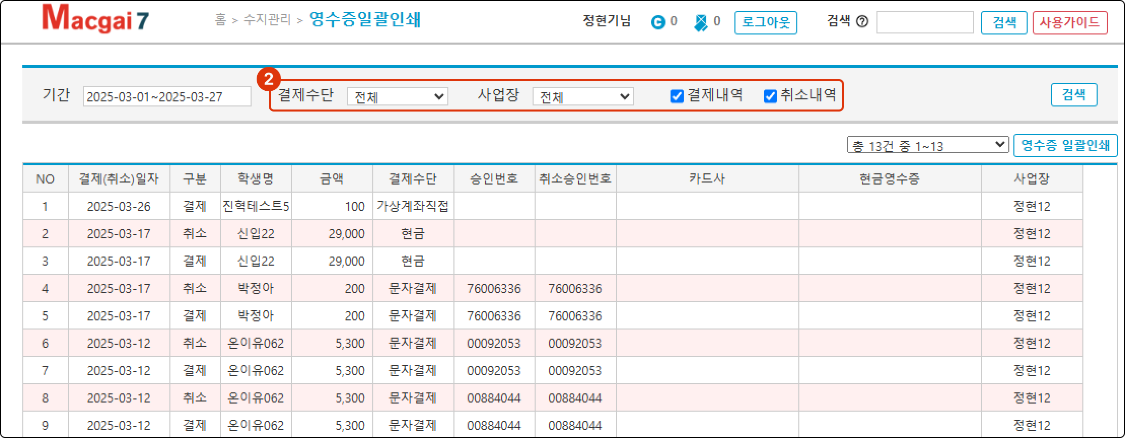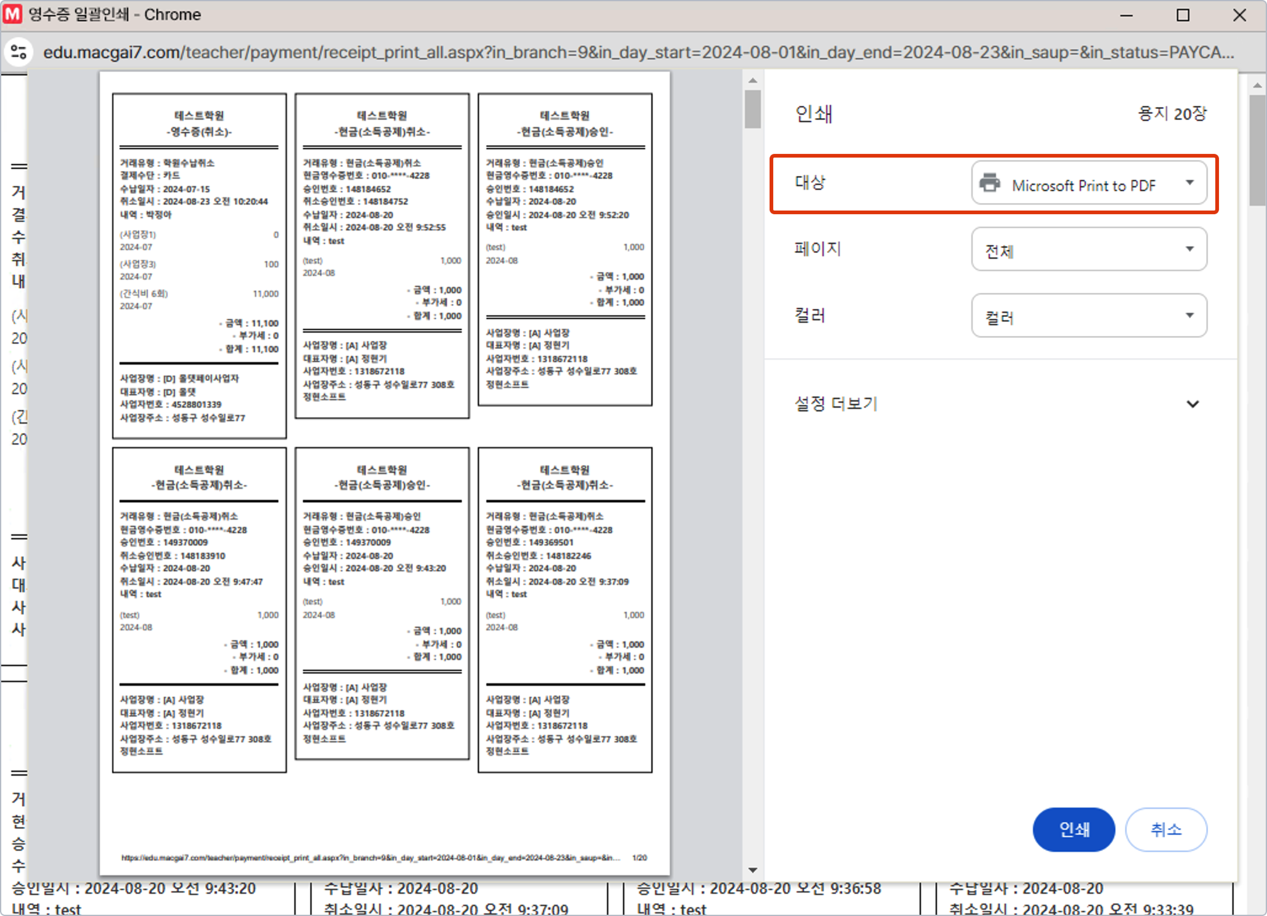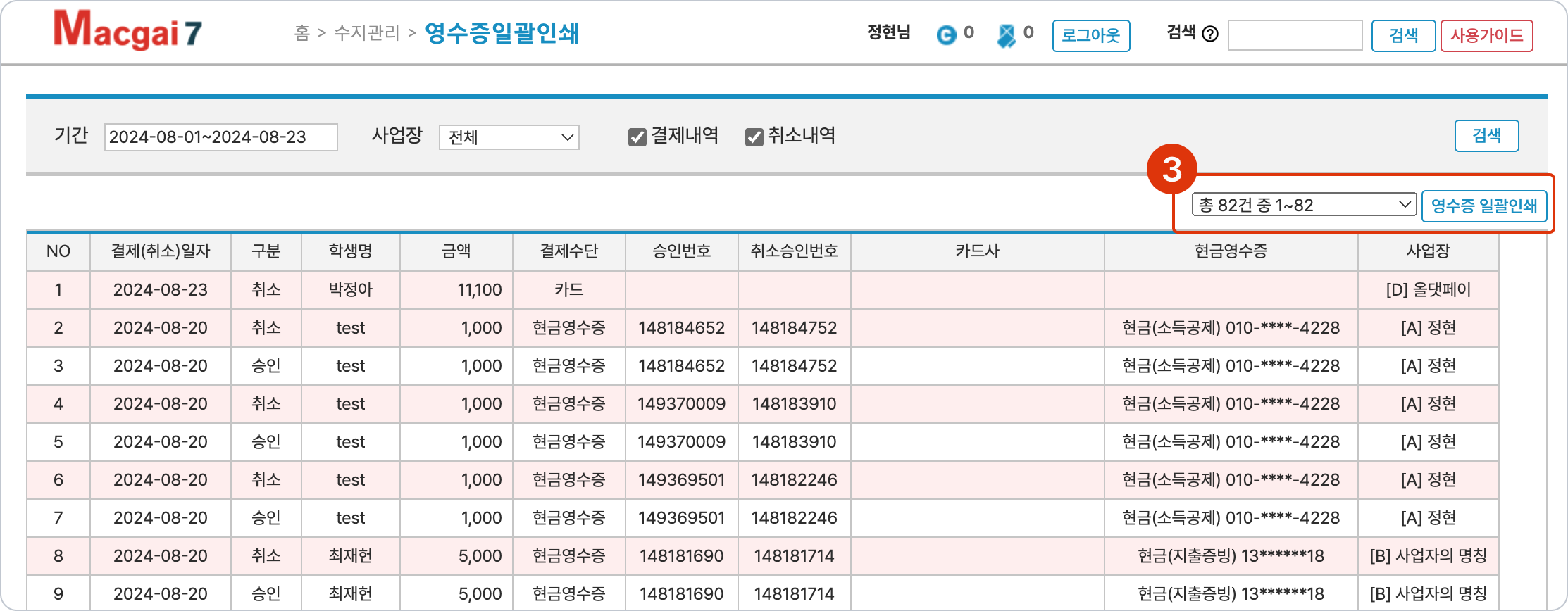 결제 목록 확인 후 [영수증 일괄인쇄] 버튼을 눌러 인쇄를 진행합니다.