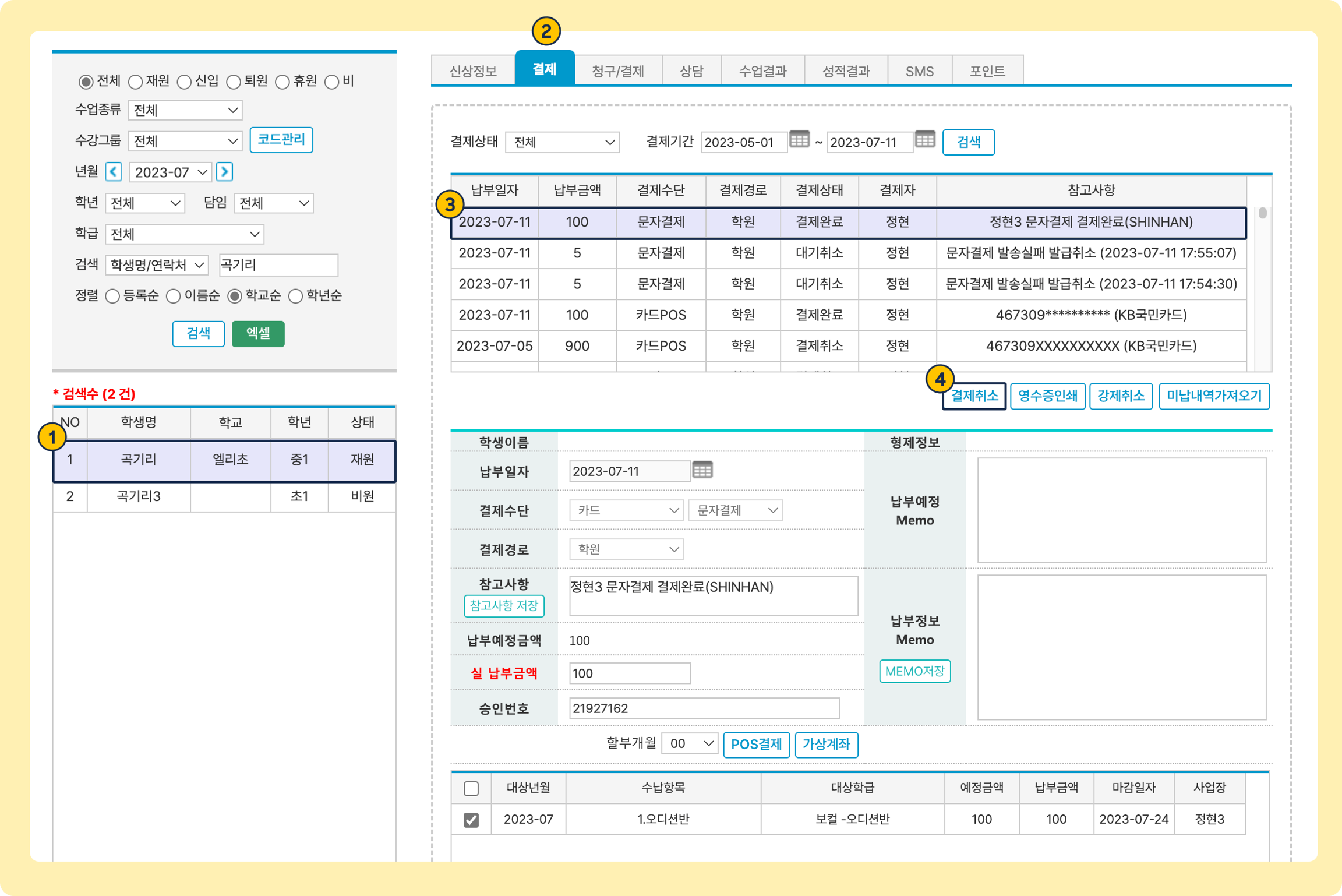[학생관리] -> [미납현황] -> 결제대기(문자결제) 일괄취소