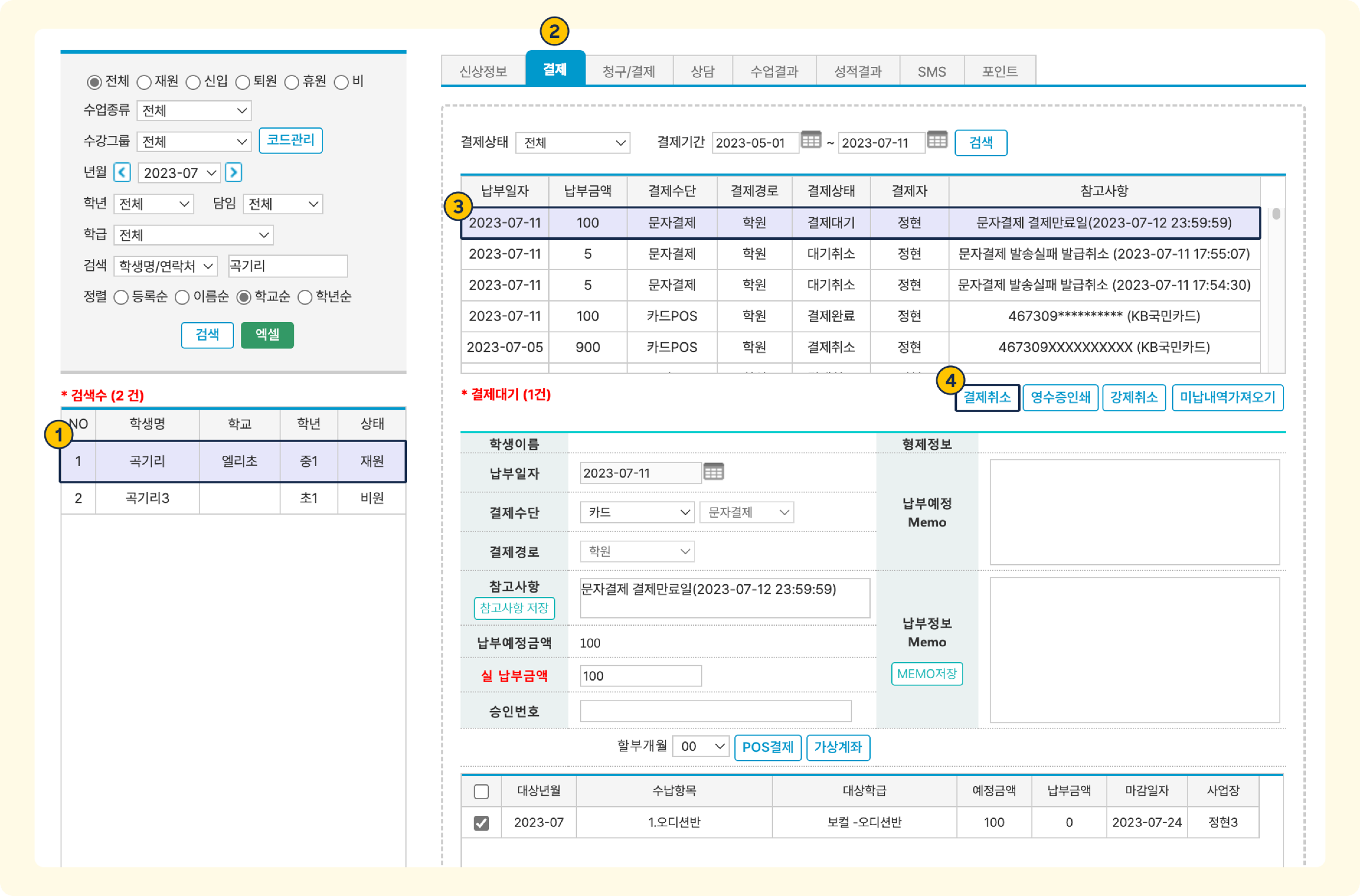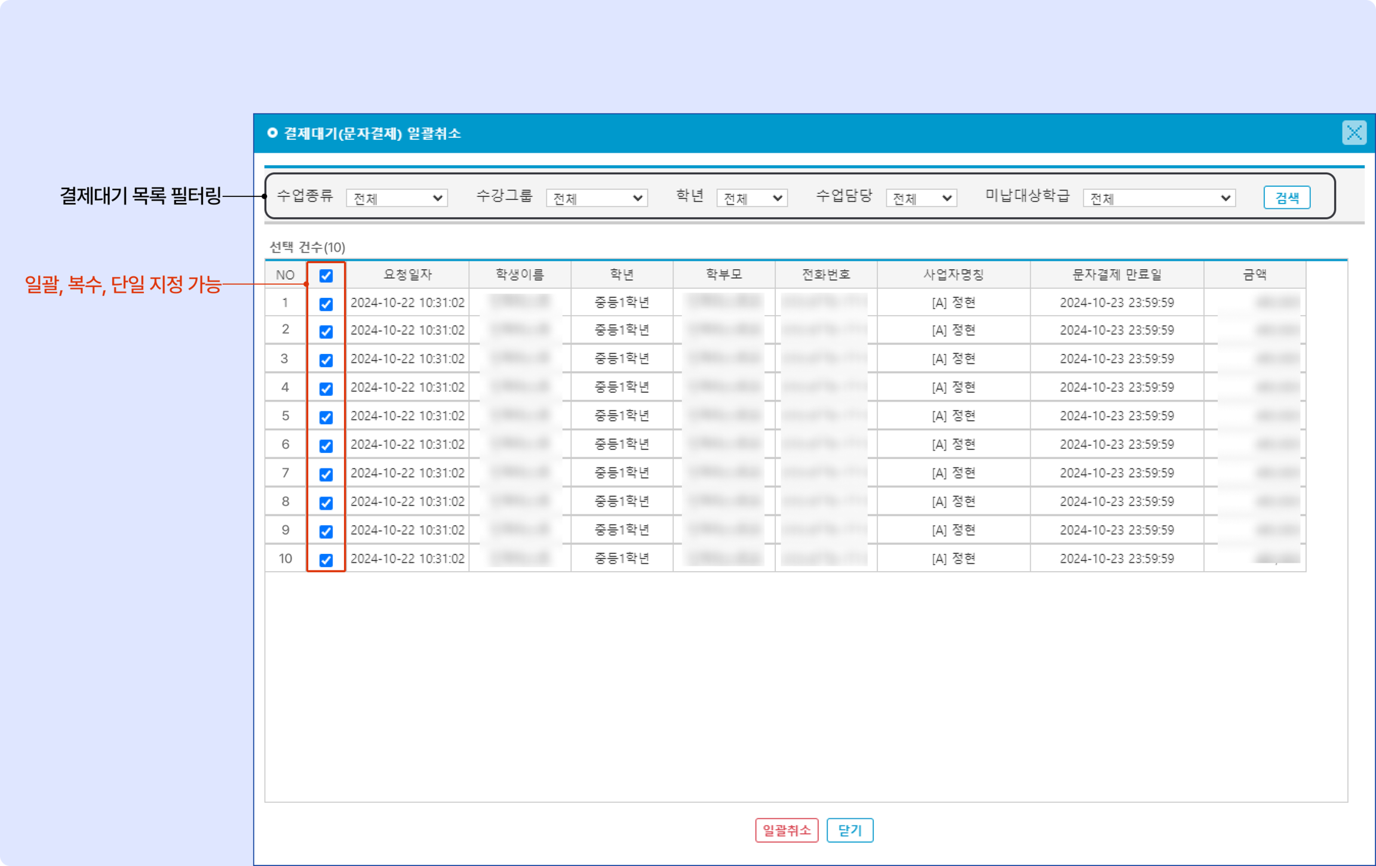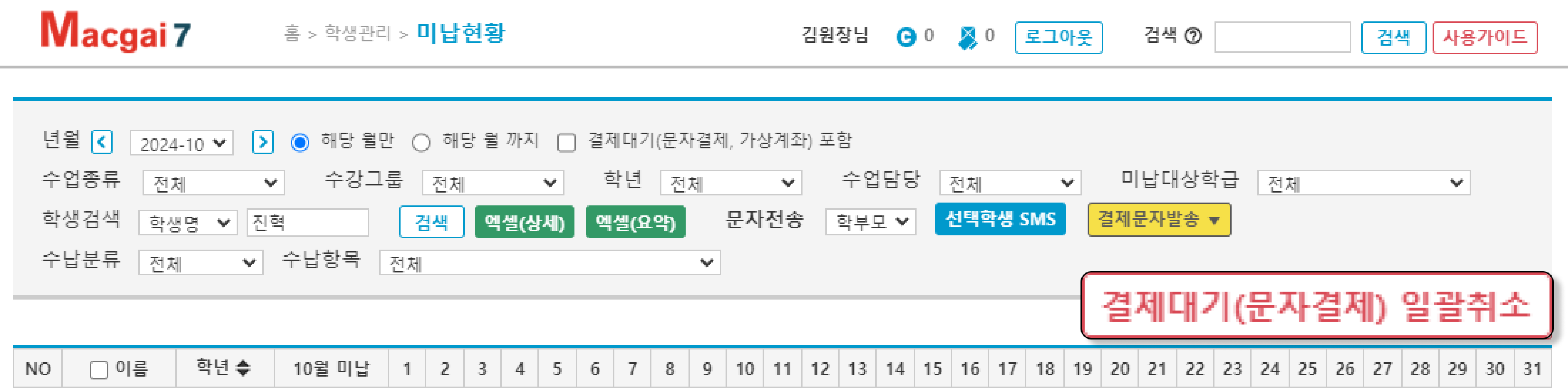 [학생관리] -> [미납현황] -> 결제대기(문자결제) 일괄취소