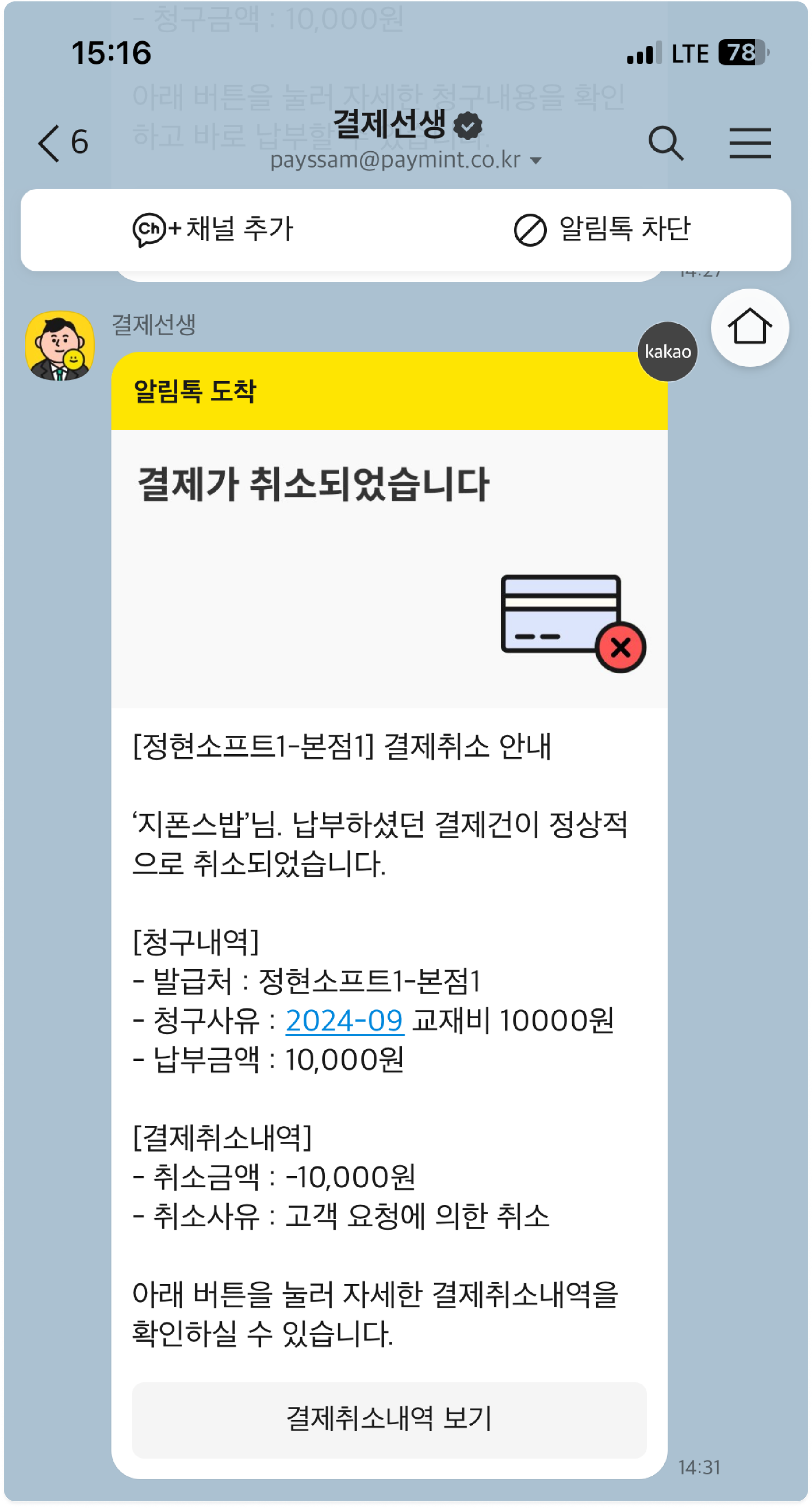 결제 취소가 완료되면 학부모님의 카카오톡으로 취소 안내 알림톡이 발송됩니다.