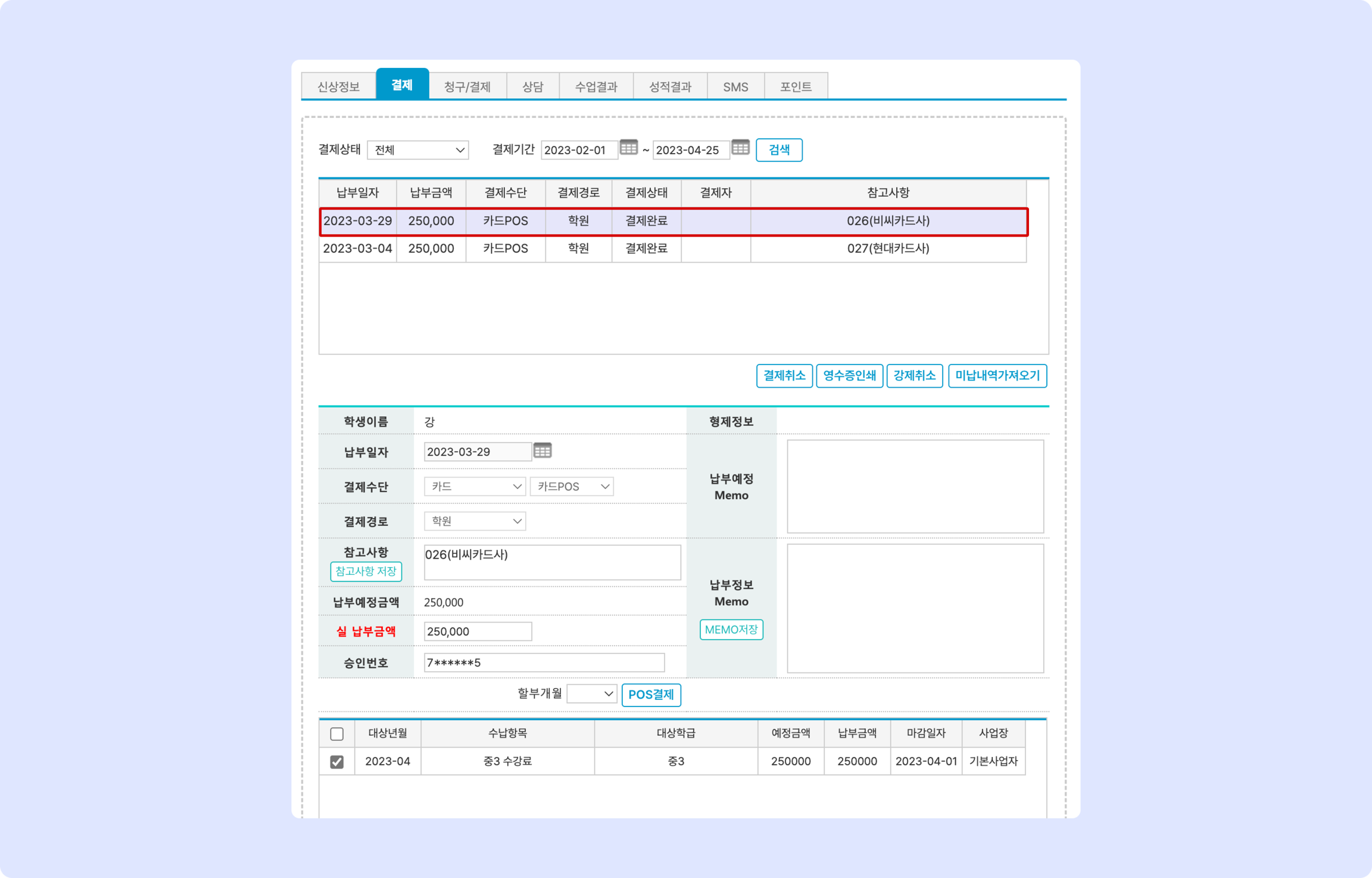 카드 | 카드 | 학원수납저장 |