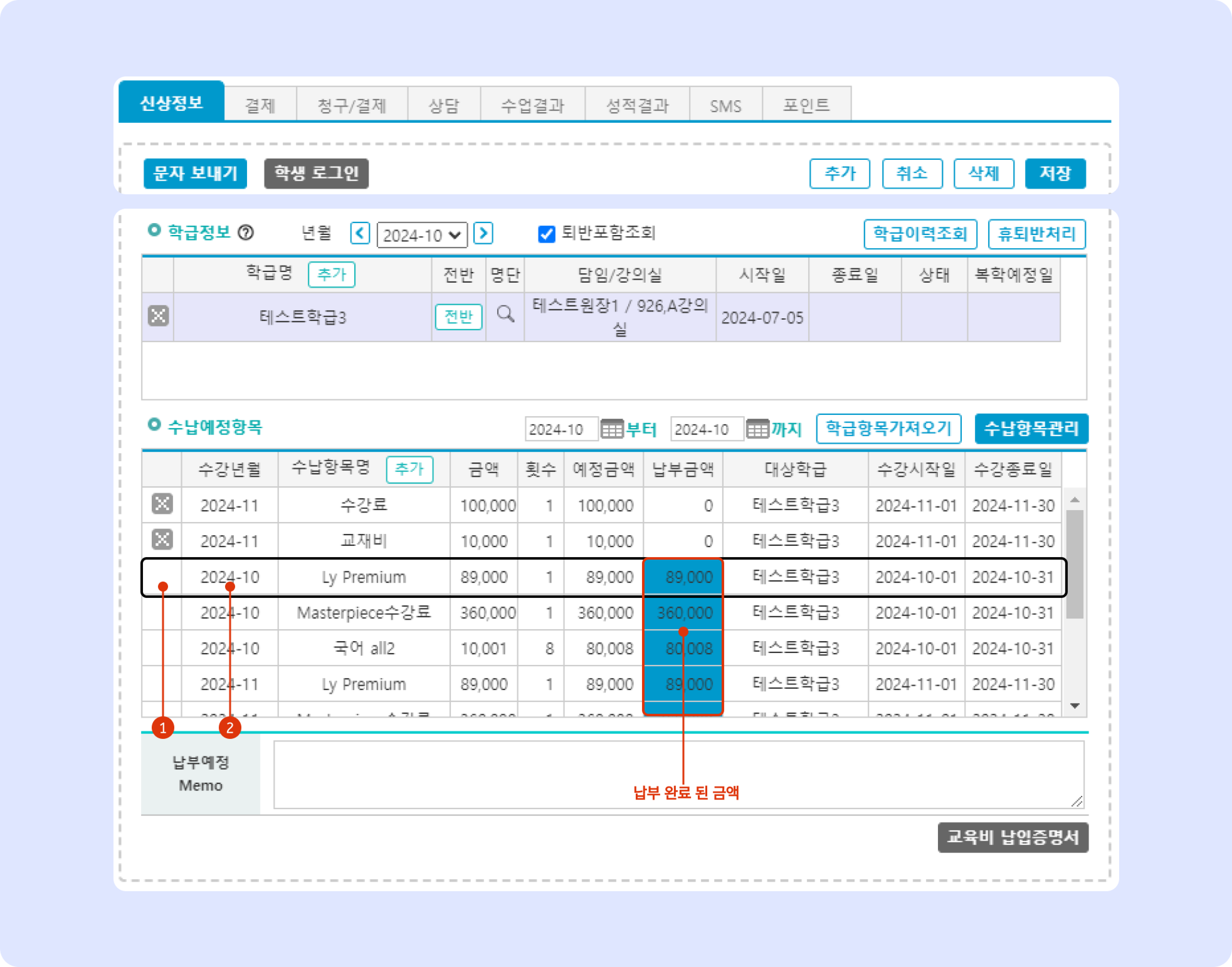 신상정보 탭: 수납예정항목 에서는 이번 달에 결제가 완료된 항목을 별도로 표시 됩니다. 미납 항목은 년월과 관계 없이 상시 노출됩니다.