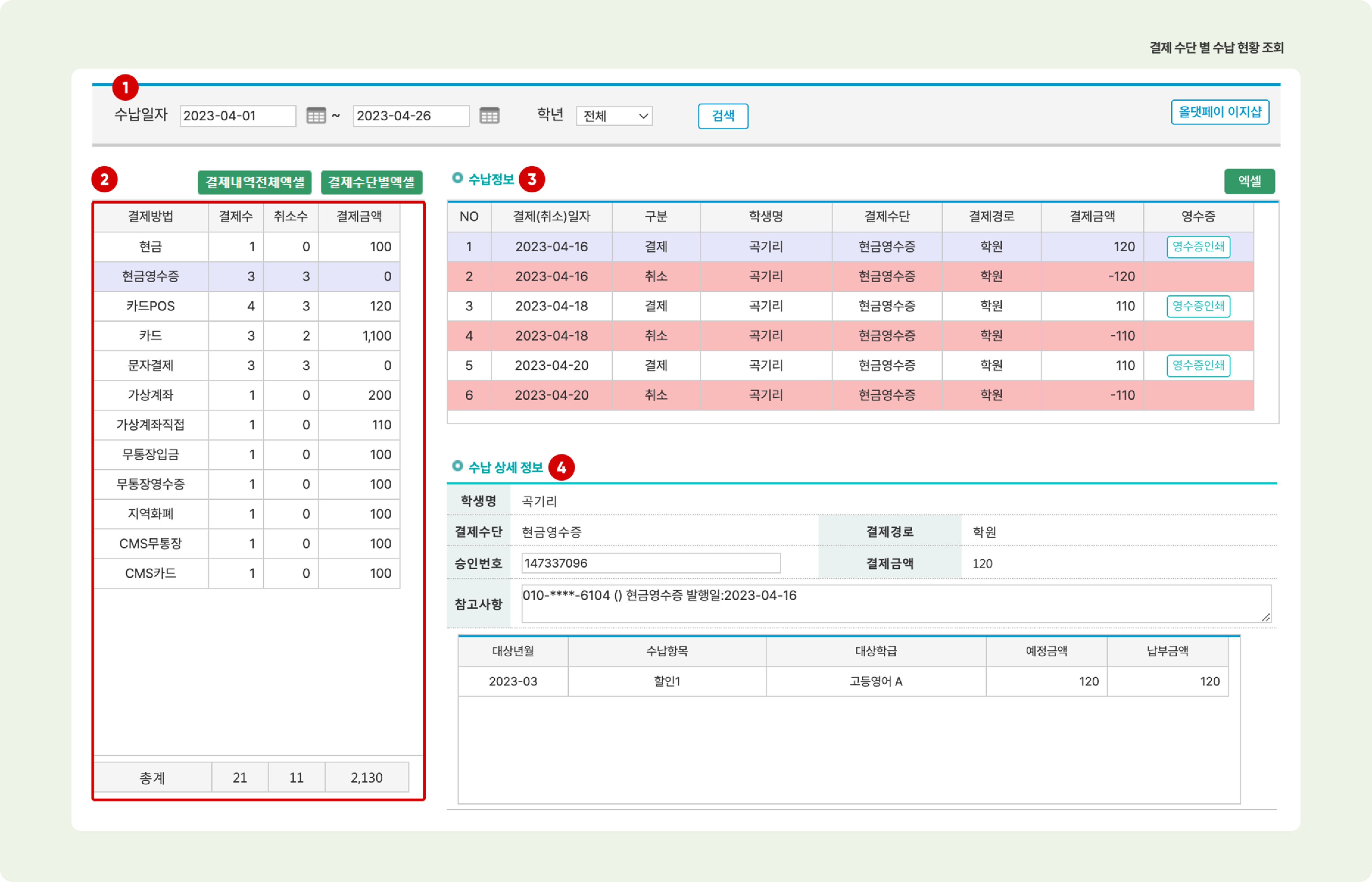 수납 상세 정보: 3에서 선택한 개별 수납 건의 상세 정보를 확인할 수 있습니다.
