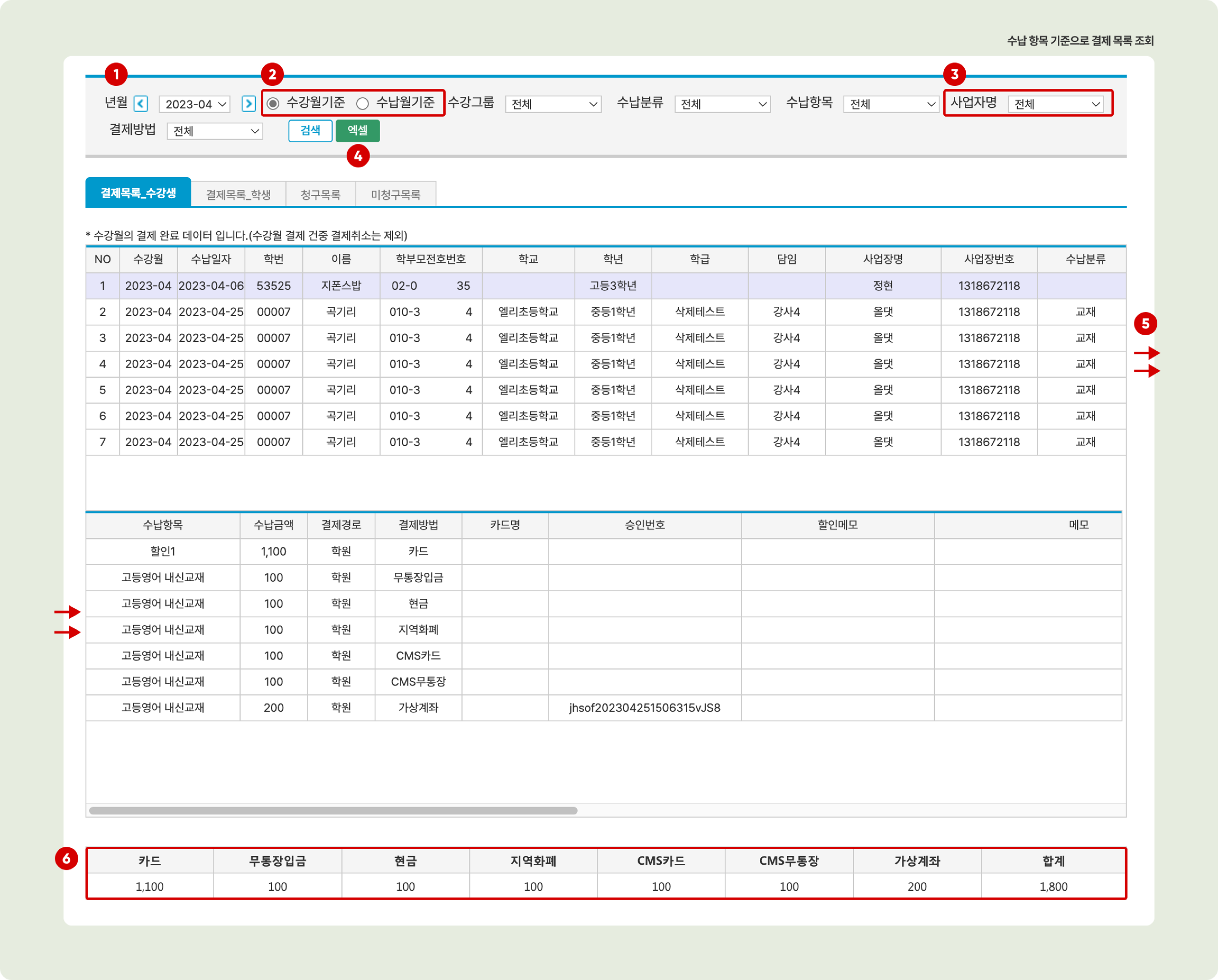 수강월 기준: 수납항목의 '수강년월'이 검색 년월과 일치하는 수납 완료 항목을 검색합니다.