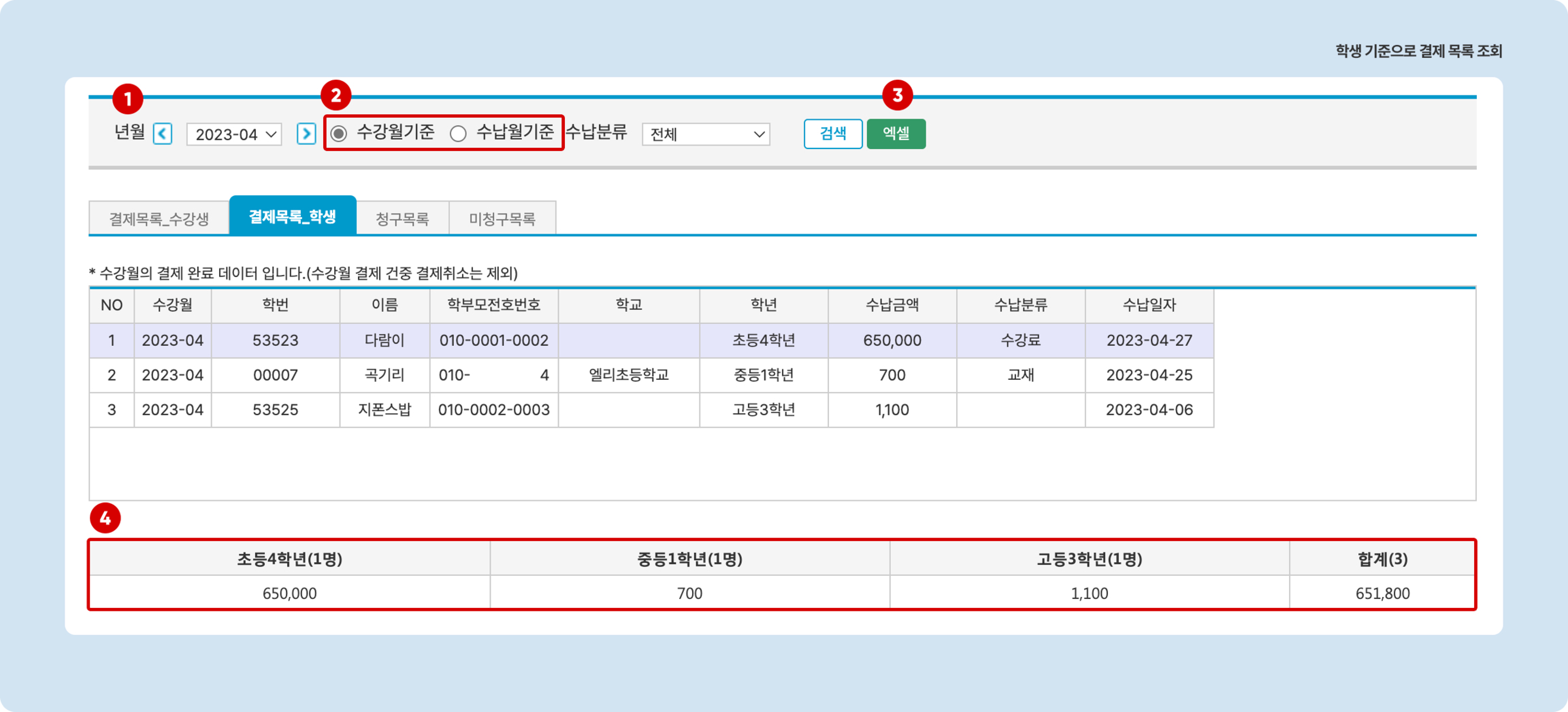 수강월 기준: 검색 연월과 수납 항목의 '수강 연월'이 일치하는 결제 완료 항목이 있는 학생을 검색합니다.
