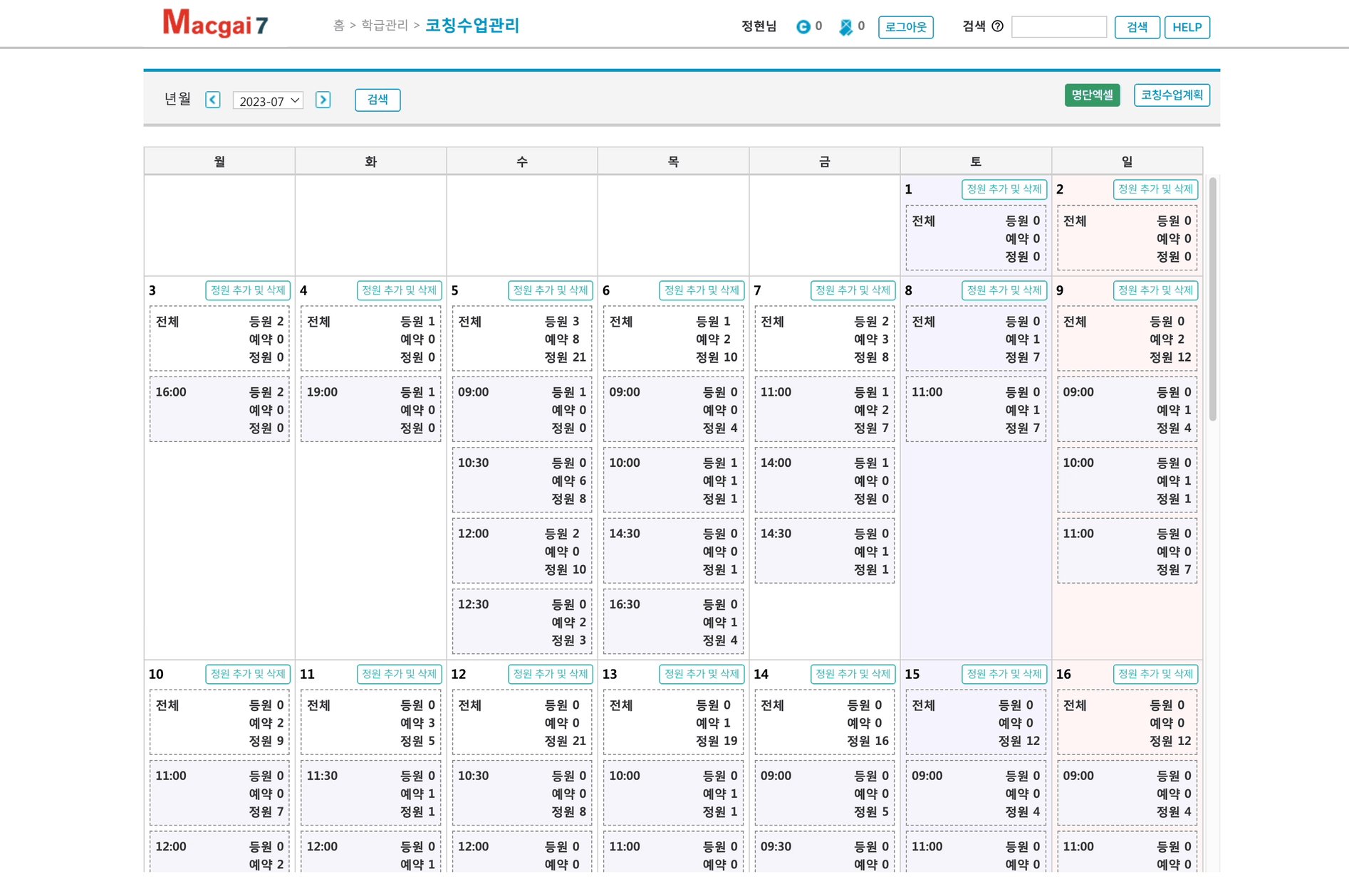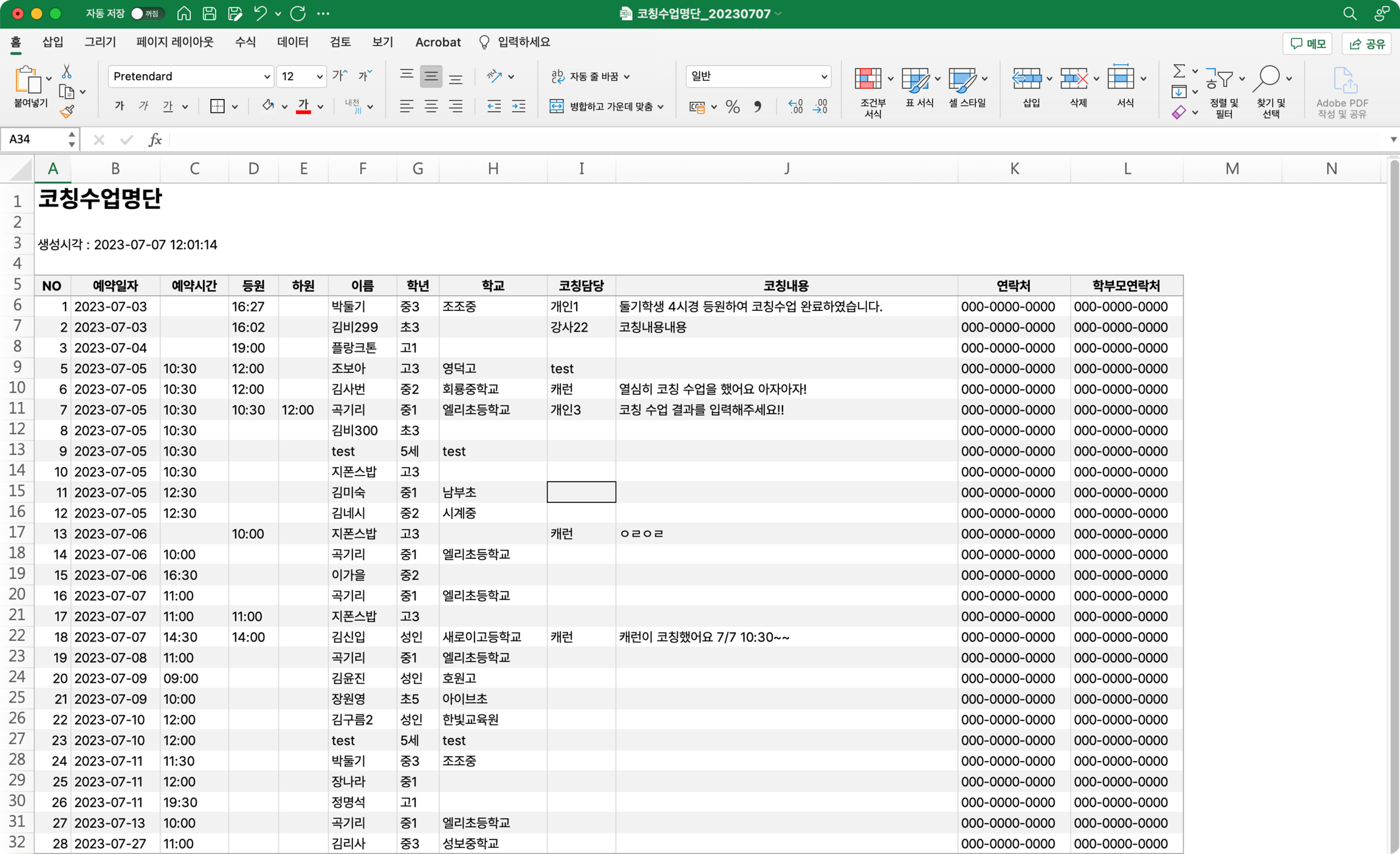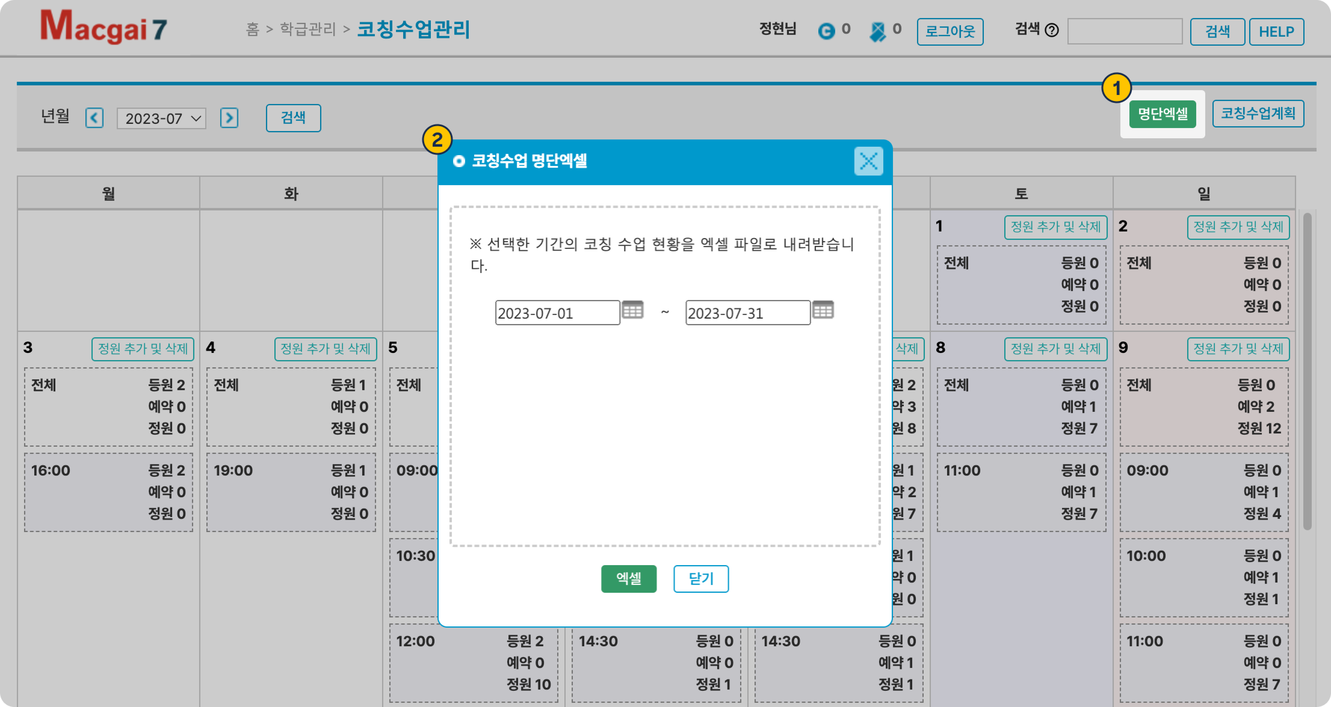 기간을 선택해 코칭 수업 현황을 엑셀 파일로 내려받을 수 있어요.