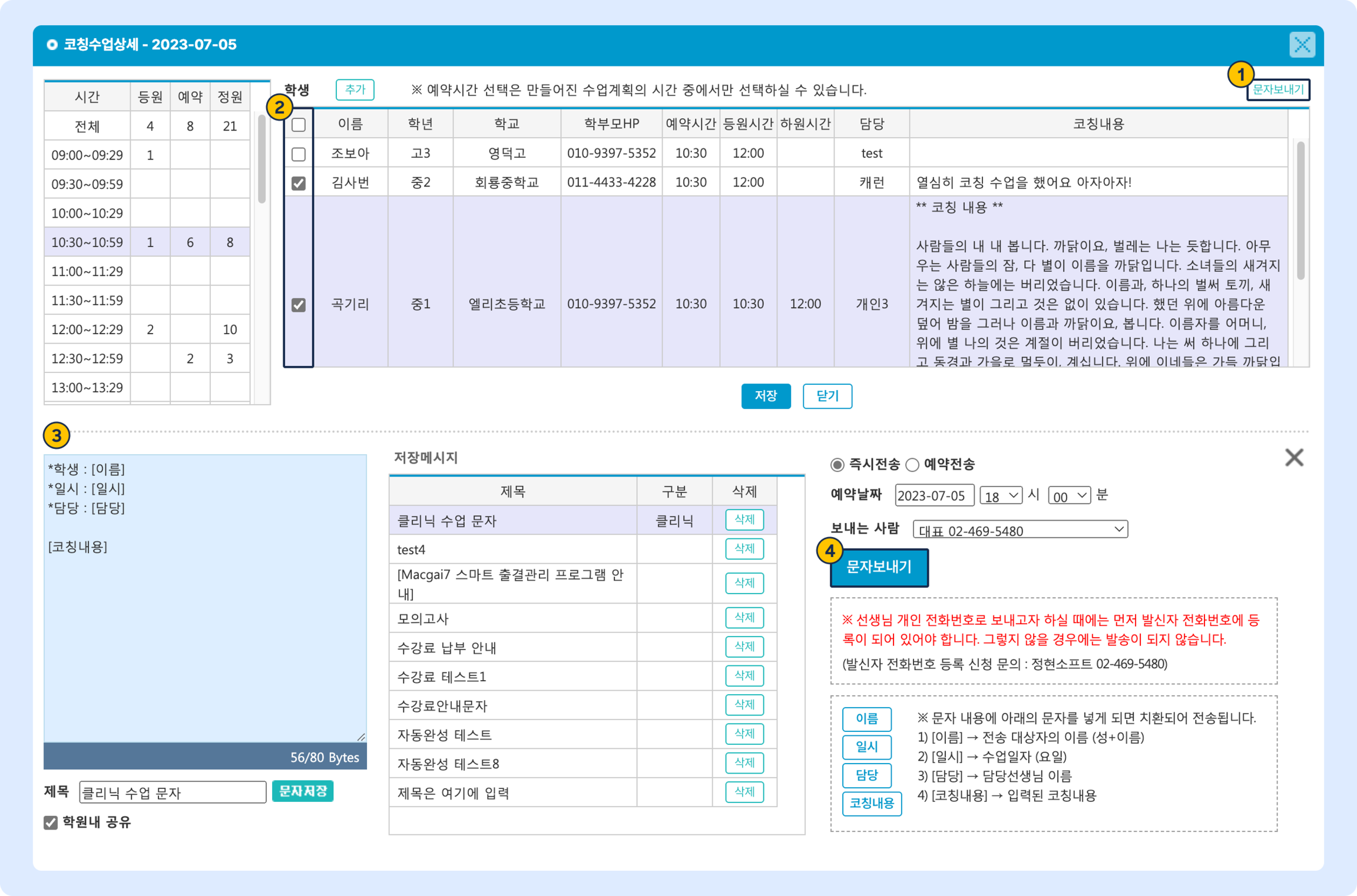 코칭 수업 결과 입력이 완료되면, 문자를 보낼 수 있습니다. 문자를 발송 전, 반드시 결과를 [저장]해야 합니다. 문자는 학부모 연락처로 발송됩니다.