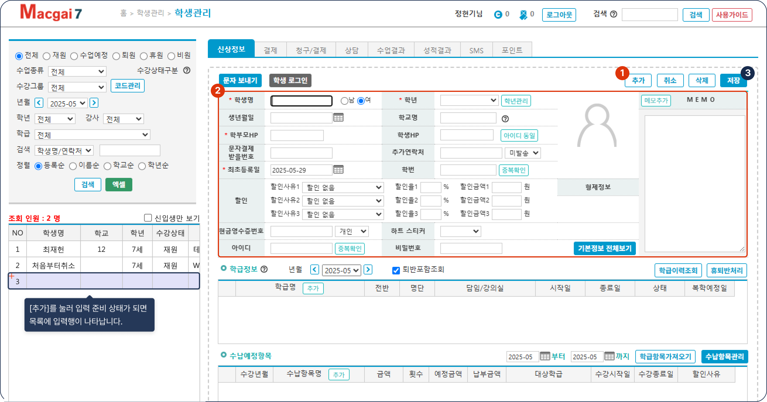 학생관리 메뉴에서 우측 상단에 위치한 [추가] 버튼을 누르면 입력 상태로 전환되고 새로운 학생의 정보를 입력할 수 있습니다.