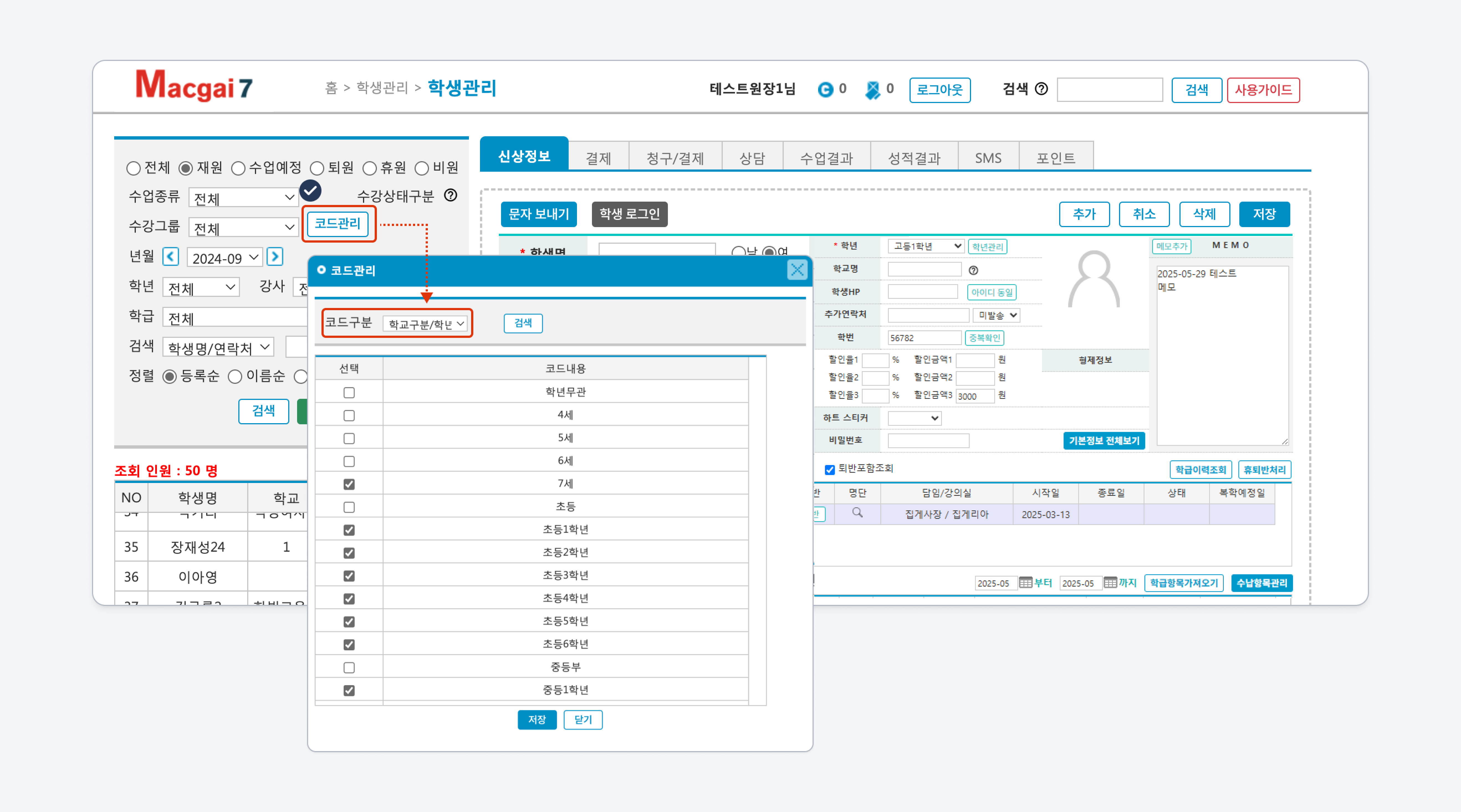 학년: 코드관리 > 학교구분/학년 에서 지정된 값만 목록에 나타납니다.