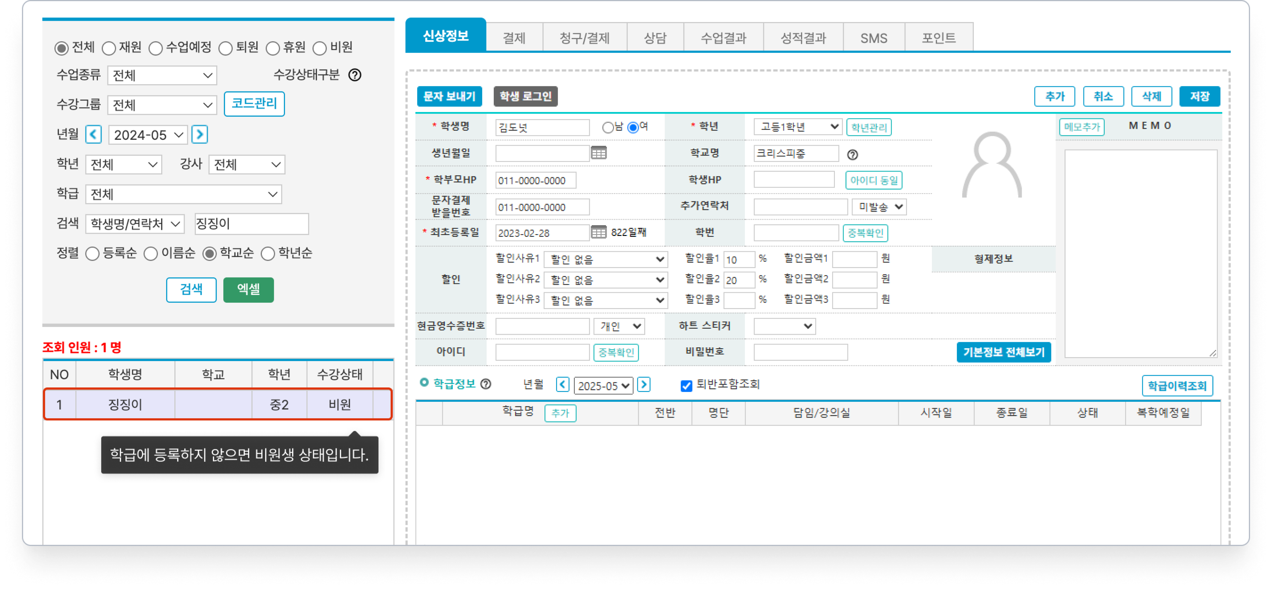학급에 등록하지 않은 상태에서 저장된 학생의 초기 상태는 '비원생' 입니다.