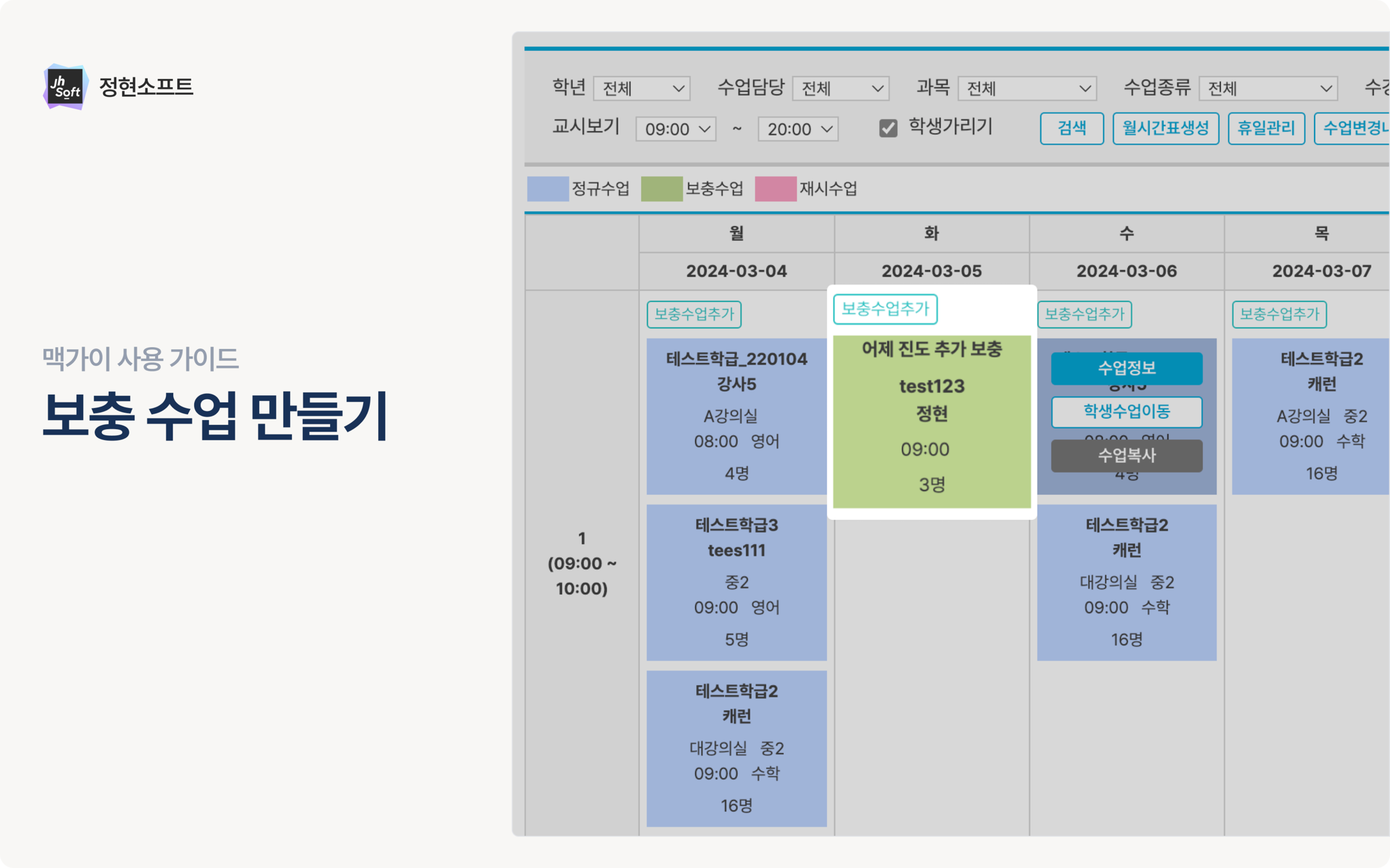 생성된 보충 수업은 전체 시간표와 수업 목록 메뉴에서 확인할 수 있습니다. 정규 수업과 동일하게 출결 및 수업 결과를 기록할 수 있어요.