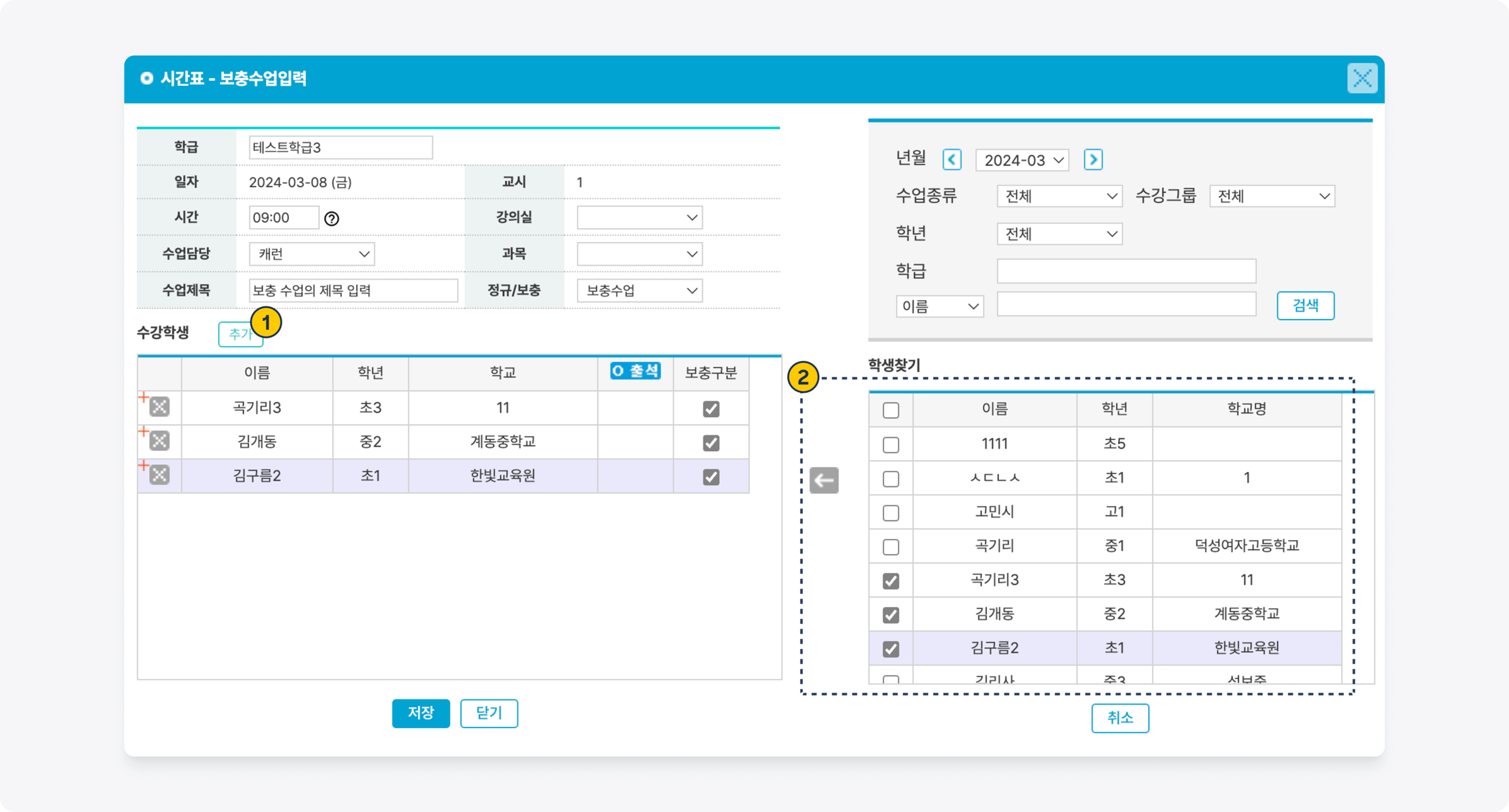 정보 입력과 학생 추가가 완료 되었다면 [저장]을 눌러 보충 수업 추가를 완료합니다.