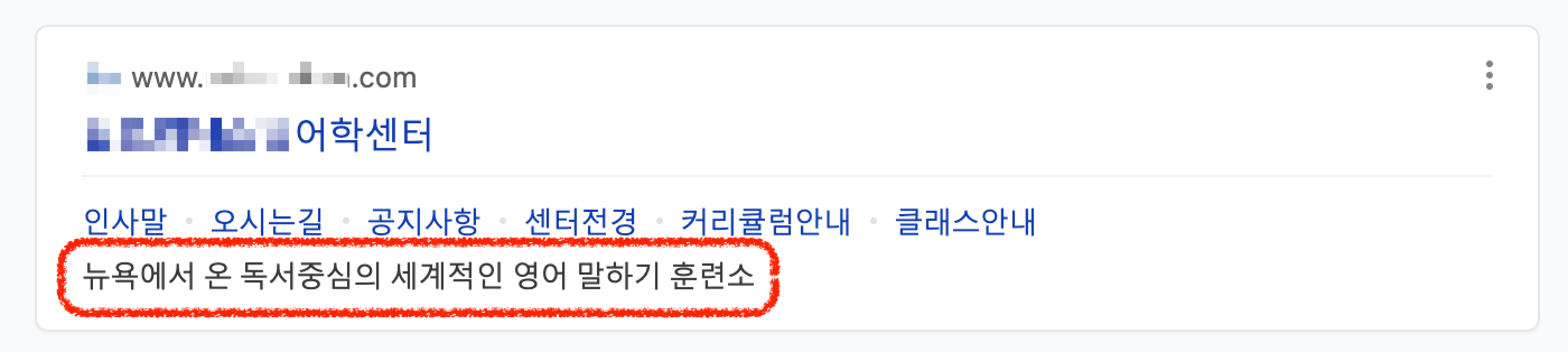 웹페이지에 대한 설명을 적습니다(30자 이내). 검색 엔진에서 학원 홈페이지가 노출되면 아래와 같이 표시됩니다.