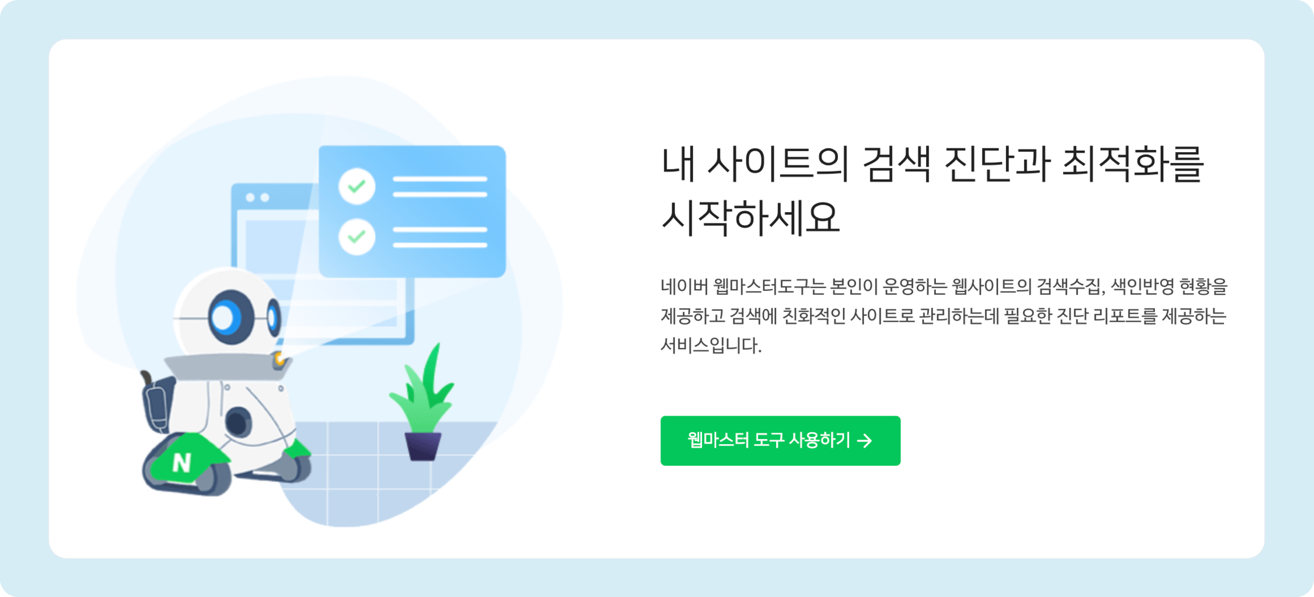 네이버 서치어드바이저로 이동하여 아래 쪽으로 조금 내려가면 보이는 웹마스터 도구 사용하기 버튼을 눌러주세요.