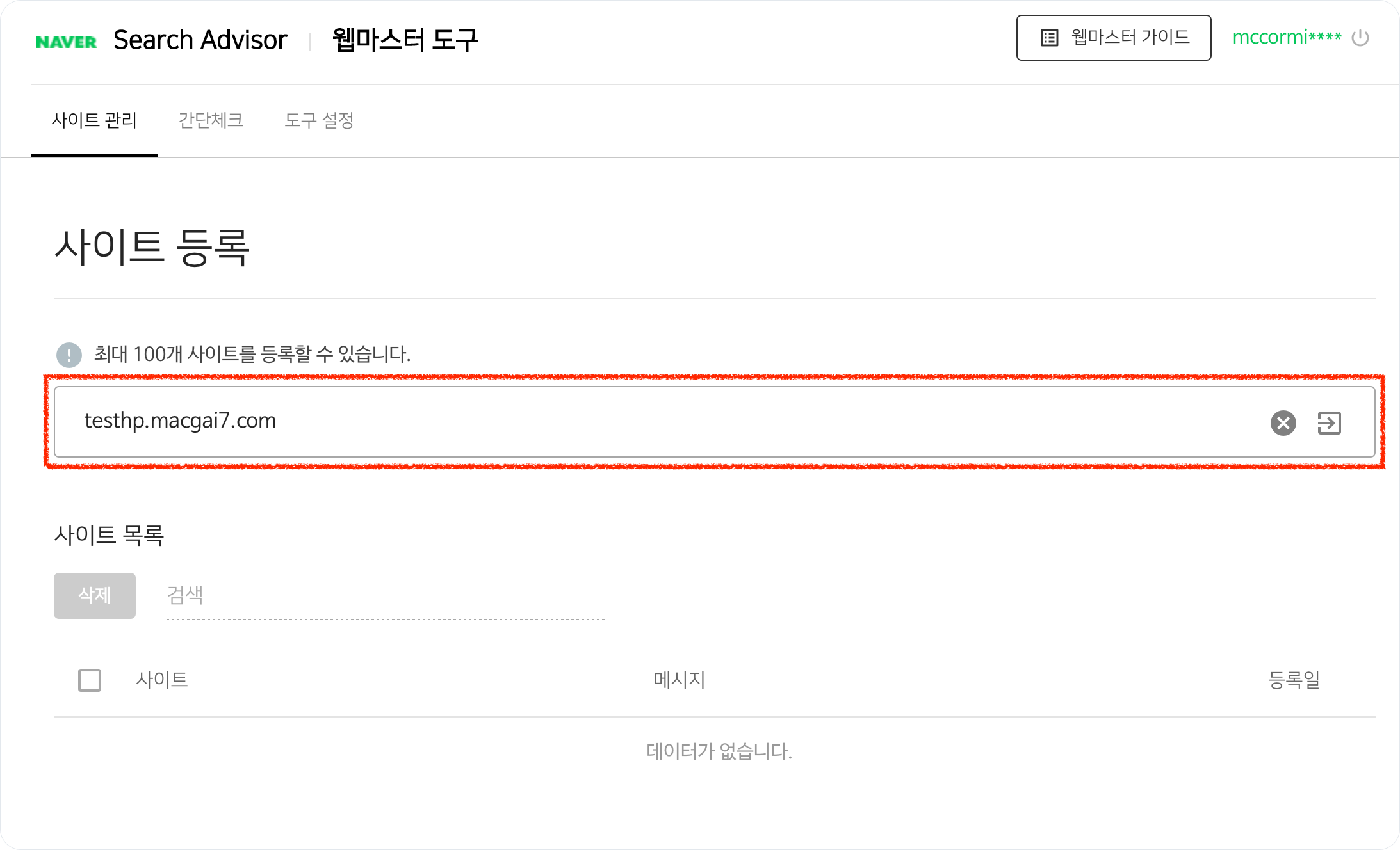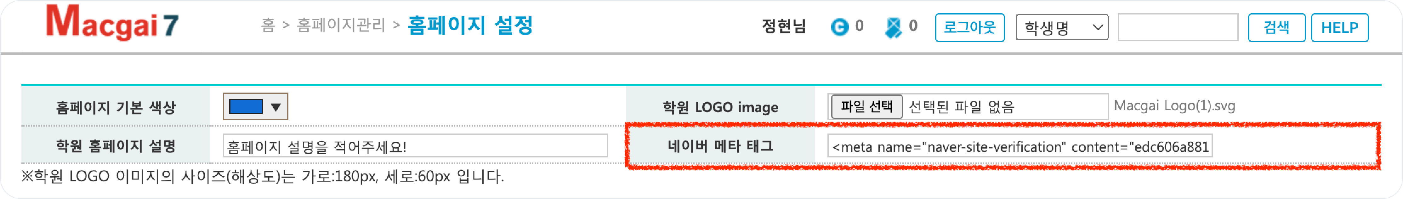 맥가이의 홈페이지 설정으로 이동하여 복사한 메타 태그를 '네이버 메타 태그' 항목 에 붙여 넣고 변경 사항을 저장합니다.