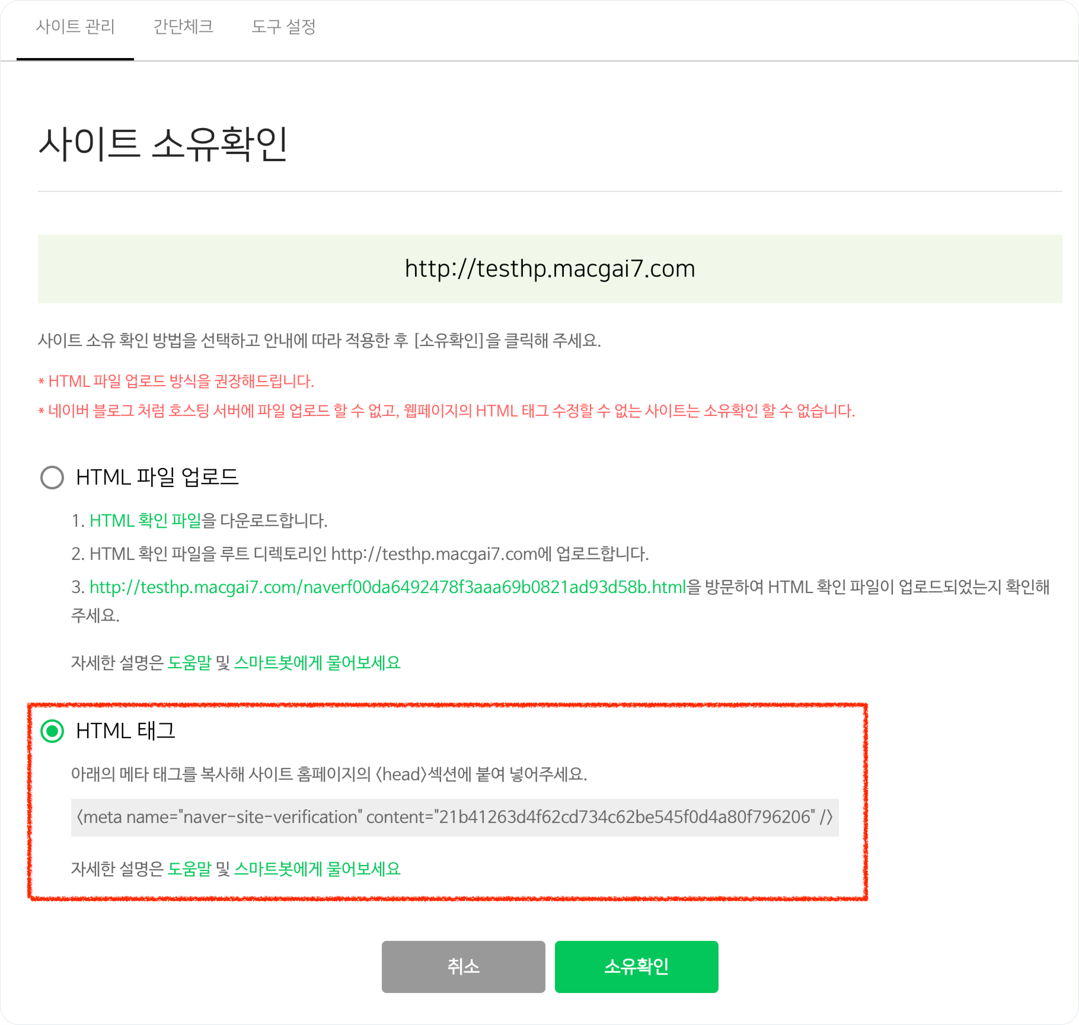 다시 네이버 웹마스터 도구 페이지로 돌아가 소유확인 버튼을 누르면 메타 태그 등록이 완료 됩니다.