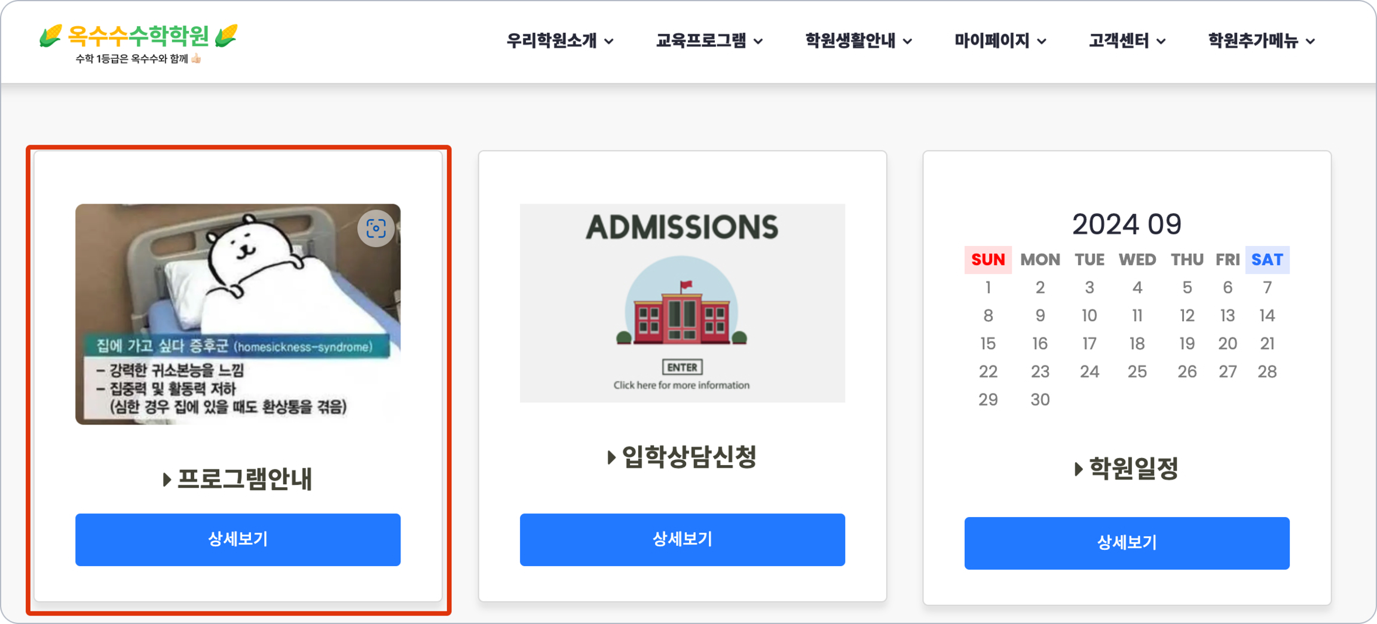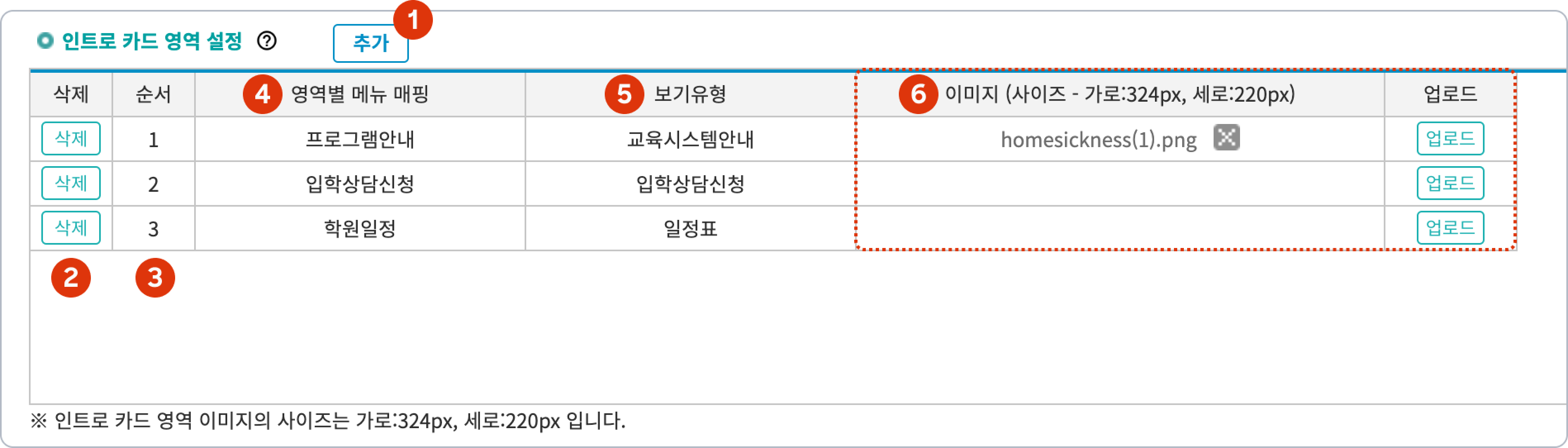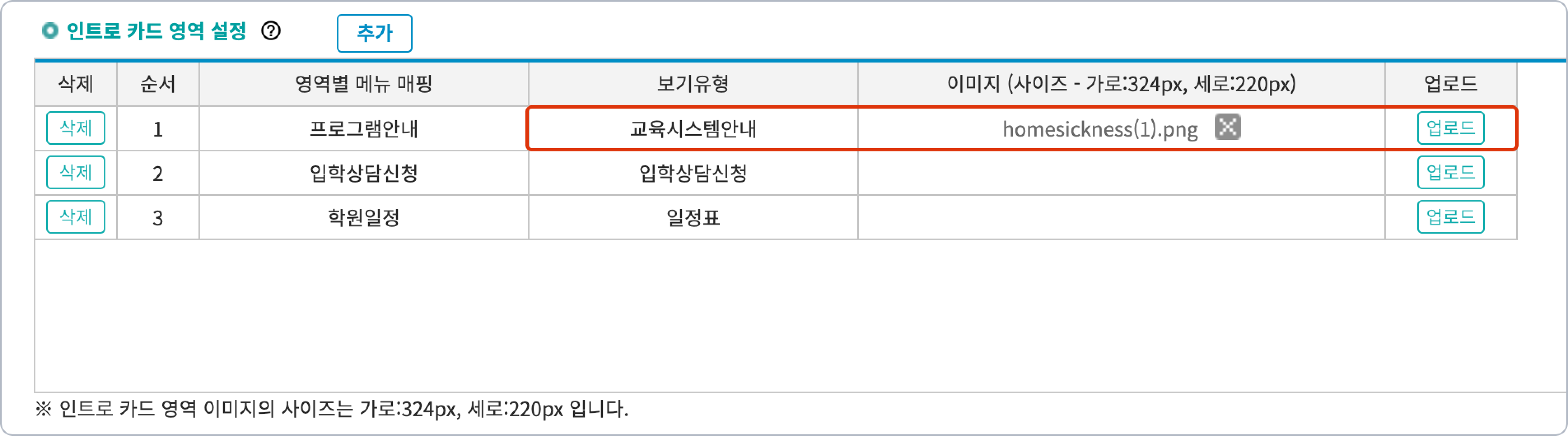 영역별 메뉴 매핑: 카드의 텍스트 혹은 [상세보기]를 눌렀을 때 열 프로그램을 지정합니다. 대메뉴/하위메뉴 접근과는 별개로 동작합니다.